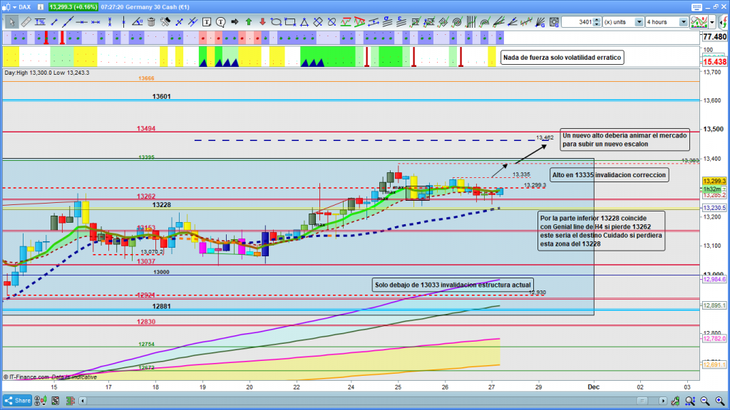 En el gráfico de 4 horas del dax30, algunos detalles que nos podrían ayudar durante la operativa del día de hoy. De momento en H4 no hay nada de fuerza y en cambio si hay volatilidad, que es lo que suele hacer que los movimientos sean cambiantes y erráticos. Técnicamente en el gráfico, zonas importantes a tener en cuenta, 13299, directriz superior de la antigua caja de consolidación, no debería ser importante, pero en un mercado sin fuerza y volátil, cualquier obstáculo para progresión del precio. Si superara esta zona, muy importante 13335, ya que un nuevo alto por encima de esta zona, invalidaría ya el movimiento correctivo, y estaríamos pese a correcciones menores de nuevo en camino alcista. Si supera 13335 y sigue camino alcista la validación definitiva de no tener de nuevo un posible doble zig zag, será un nuevo alto por encima de 13383, último máximo. En el caso de movimientos erráticos, y si no realiza nuevo máximo por encima de 13335, la perdida de la zona 13275 y sobre todo 13262, nos llevaría a testear la cota histórica y cota de apertura anual 2020, del 13228. La perdida de 13228, con cierres de velas de H4 progresivas, nos pondría en una zona más complicada si cabe que la actual. Terreno difícilmente operable y muy complicado, ya que técnicamente se podría dar de nuevo un amplio lateral, pero si recordáis el párrafo inicial de este análisis, este hecho a estas alturas del año, podrían acabar con el sentimiento comprador y acelerar los movimientos de forma importante.