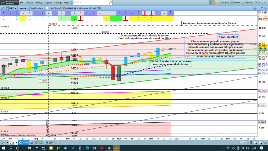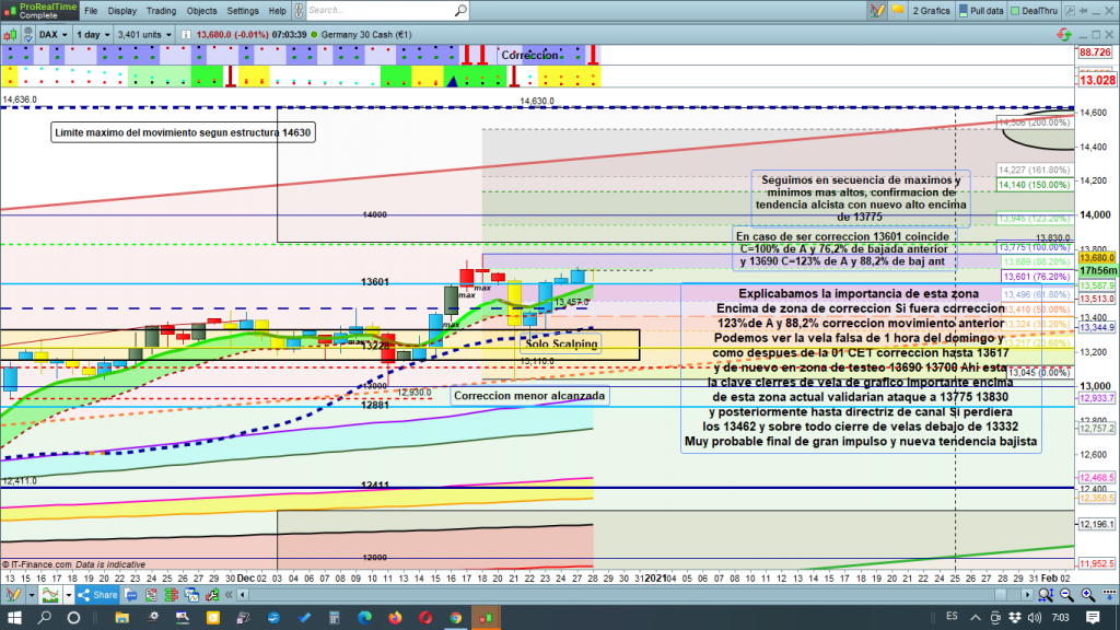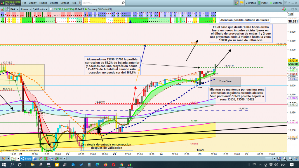 En gráfico semanal del dax30, solo resaltar que pese al cierre de la semana pasada con una pluma espectacular y posible patrón de indecisión o cambio, en la apertura de la actual semana, hemos tenido un máximo más alto que la anterior, lo que en principio validaría continuidad del movimiento alcista, después del rally bajista que supuso la corrección del lunes pasado. De momento el nuevo alto parece indicar con ciertas probabilidades, el ataque al último máximo importante en 13775, que si lo supera sí que validaría ataque a máximo histórico 13830, y/o su zona de influencia, recordar que pese a los dos rechazos anteriores en 13735 y 13775, por activación de órdenes de toma de beneficios, las posibilidades de un nuevo ataque a la zona a esta hora, a casi dos horas de pre apertura del día siguen siendo claras y altas. En el gráfico de diario, un poco la confirmación del movimiento en curso. La zona 13690 13700, es la zona más probable de testeo aun teniendo en cuenta las dos posibles opciones. Si es impulso es obvio que por proyección de la posible onda 3 nos llevaría a 13830, por tanto bastante por encima de los 13700, y aun observando la posible corrección de un ya movimiento bajista más importante, lo que podría ser una onda 2, justo en la zona comentada coinciden la proyección del 123% de una posible onda A, así como el 88,2% de corrección de la bajada anterior dese 13775 hasta los 13045 del pasado lunes, teniendo en cuenta que el dax suele tener unas correcciones donde C es el 161,8% de la onda A y en este caso esto era imposible, porque superaría la zona de inicio y por tanto no seria corrección, la pauta más normal sería la siguiente esta de 123% de A para C y en el caso de una posible onda 2, la corrección normal del dax suele ser entre el 61,8% y el 76,2% casi siempre más próxima al 76,2%, pero en las ondas 2 de grandes cambios iniciales es muy normal ver correcciones del 88,2%, por tanto, la coincidencia en la zona ya hacia que está fuera muy probable desde el primer momento. Esto nos indica que esta zona en la que estaremos en la pre apertura y la apertura del día de hoy sea una zona muy importante de decisión para las próximas sesiones, el cierre de velas por encima de 13700 o un alto sobre 12775, validarían el primer objetivo de 13830 con nuevo máximo histórico, y zona de corrección menor antes de proseguir con el impulso. Mientras esto no ocurra, estaremos en situaciones de alta volatilidad, con recorridos en ambas direcciones sin tener objetivos claros, ya que la posibilidad de rally bajista no se confirmaría hasta la perdida de 13462, y sobre todo validaciones con cierres de velas importantes por debajo de 13332.
