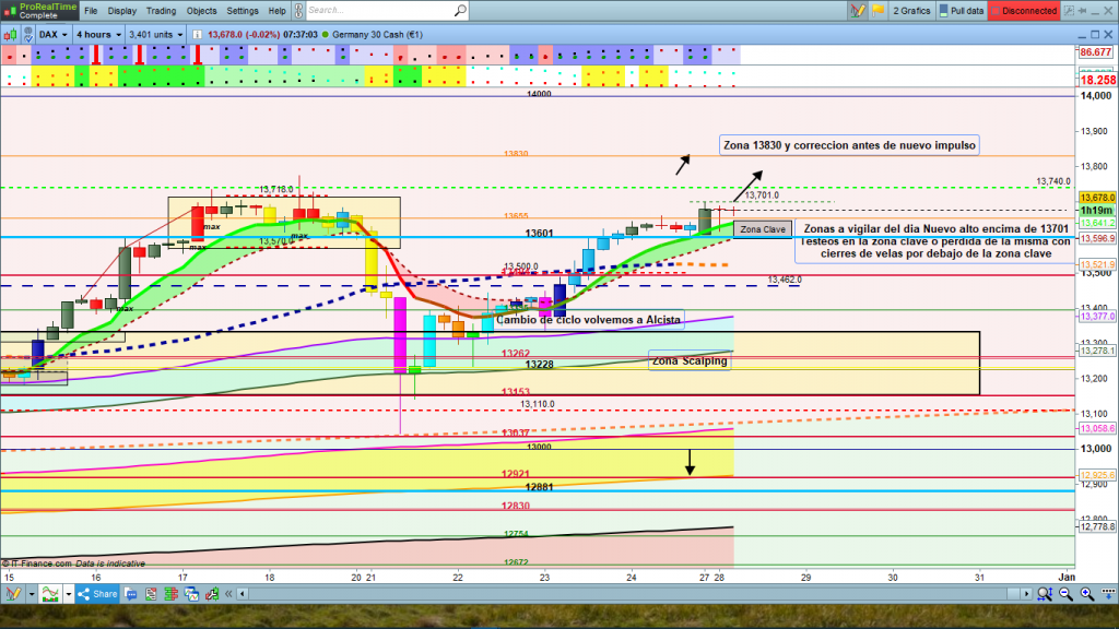 En gráfico de 4 horas del dax30, poca cosa más a añadir, nuevo alto por encima de 13701, fuera de las horas de volatilidad de pre apertura o apertura, o para más prudencia, esperar cierre de velas para validar movimiento, darían continuidad a la opción de tendencia primaria alcista. Atención en la zona clave del día, entre los 13645 y los 13601, la perdida de esta zona con validación por cierres de velas significativas, nos darían un territorio complejo de posibles movimientos erráticos, solo como ya explicábamos antes la perdida con validaciones de 13462 y sobre todo 13332, nos darían validación para un cambio de dirección y de posible estructura aunque aun sea un poco precipitado, si ocurriera deberíamos ver los detalles de la posible nueva estructura.