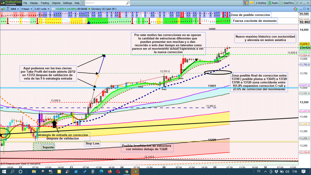 En gráfico de 4 horas del dax30, nuevo máximo histórico del dax, y atención a la zona en la que estamos en pre apertura, ya que con el testeo de ayer por la mañana a la zona del 13829, tuvimos una corrección pero completamente lateral sin apenas recorrido correctivo, aunque como comentaba en algún párrafo anterior según Gann, cuanto más tiempo tarde en hacerse una corrección, más pequeño será el recorrido de la misma, y esto es calculable matemáticamente, más concretamente es la base de mi túnel Domènec, una mezcla de los cálculos de Elliot para el cálculo de las posibles zonas de corrección, más toda la teoría de Gann, con la participación de la variable tiempo. Sin embargo, podría haber sido solo una pequeña corrección y ahora venir a corrección de la última estructura del movimiento, la respuesta es muy posible que la tengamos a las 9 h con la apertura del parquet de Frankfurt. En caso de cierre de esta vela actual de 4 horas, por debajo de 13873, será muy probable una corrección de nuevo a la zona del 13780 a 13720, con posible pluma por debajo de esta zona incluso con posibilidades de volver a visitar 13601, aunque si nos fijamos en la fuerza del impulso y las correcciones solo laterales realizadas hasta ahora, no se ve muy probable.