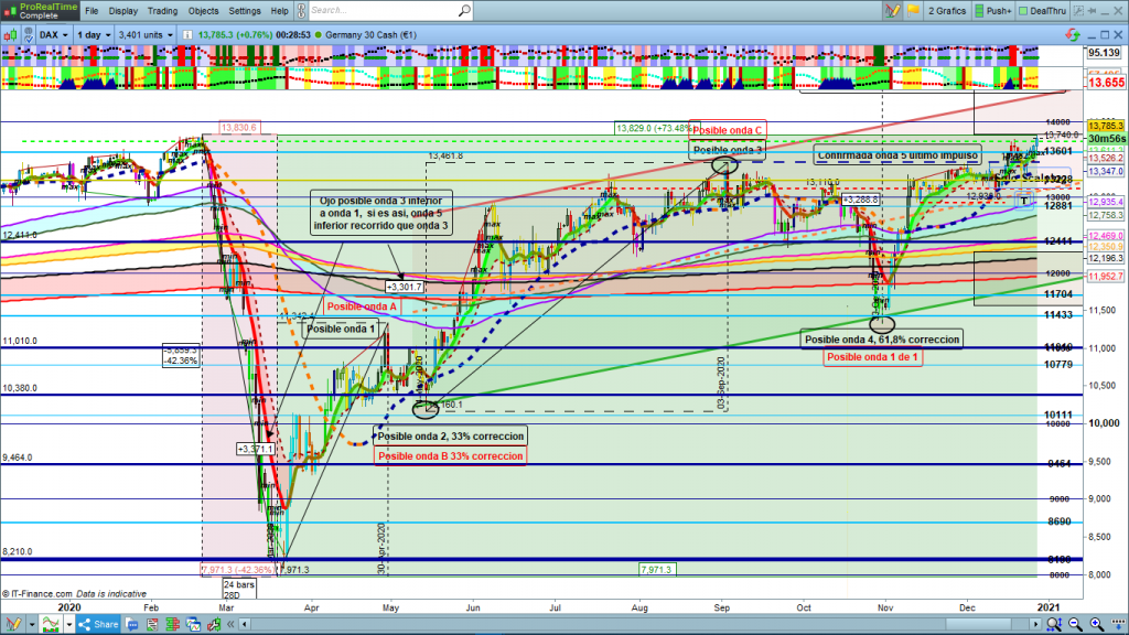 Llegó hasta 13820, y hasta 13829, a solo un punto del máximo histórico del dax, alcanzado este mismo año el 20 de febrero. El año 2020, ha sido realmente espectacular, todo se ha acelerado de forma increíble, máximo histórico el 20 de febrero en 13830, solo menos de un mes después el 19 de marzo, el dax había perdido 5859 puntos, para una perdida desde máximos a posible 0 del 42,36%. Y no os engañéis el 20 de febrero cuando empieza el rally, no hay ni un caso local europeo, solo algunos viajeros de China, ni en EEUU, allí en aquellas fechas se reían y no querían ni aceptar 52 posibles positivos, la mayoría asintomáticos. El COVID 19 no preocupaba a nadie en occidente, ni a inversores ni a grandes bancos, ni a gobiernos ni a la sanidad de ningún país, era aquella época que en España Fernando Simón, comentaba que a lo mejor podríamos tener uno o dos casos como mucho y exportados de alguien que viniera de viaje. Ahora ha quedado la idea que aquella bajada se produjo debido a la pandemia cuando la verdad es que cuando se produjo la validación técnica de la corrección, la COVID 19 ni siquiera era noticia. Resumiendo de 13830 a 7971 en menos de un mes, y desde allí rebote, ayer día 28 de diciembre del 2020, si el mismo año, la cotización había subido de nuevo 5858 puntos, para unas plusvalías del 73,48%. Esto son los mercados, especulación y movimientos 100% técnicos.
