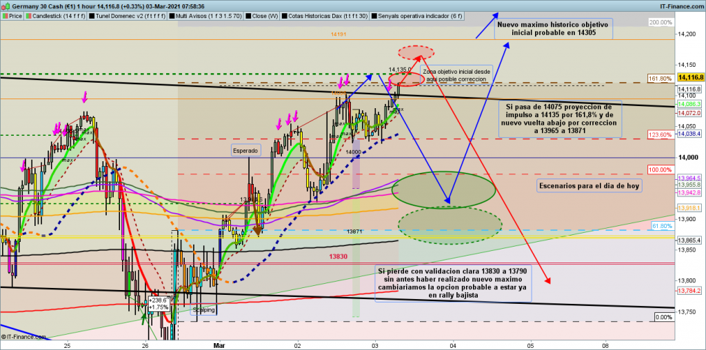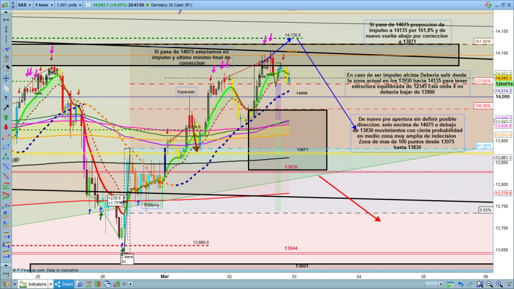 En gráfico de 1 hora del dax30, ya pasadas las 6 h en plena sesión asiática, vemos varias cosas interesantes. Al final el cierre de la vela diaria a las 01 CET, no fue en forma de doji como parecía una hora y media antes del cierre (la importancia de esperar siempre al cierre de las velas, las cosas nunca son como parecen, sino como acaban), sino que fue vela de continuidad alcista. Esto es lo que ha hecho que durante asiática la cotización dax, siguiera subiendo en busca de la zona objetivo en los 14120 a 14135 puntos, quebrando la directriz superior. Mucha atención a esta zona que dependiendo de la figura en curso podríamos tener corrección, para después seguir subiendo, o continuidad del movimiento, o en caso de onda 2 bajista final de corrección y posterior gran bajada.