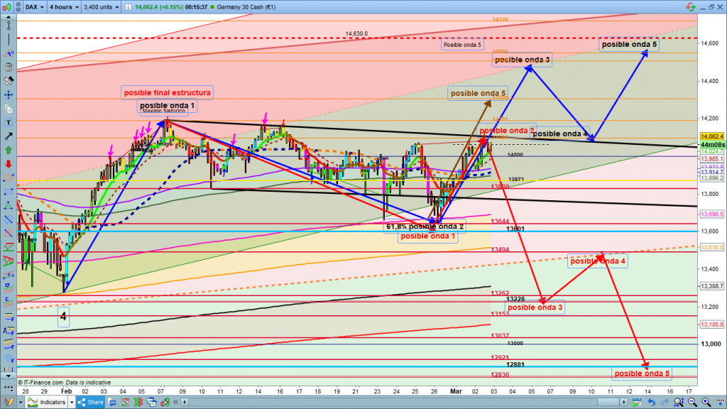 Aquí tenemos las 3 estructuras posibles, zonas a vigilar muy especialmente, 14120, 14192, 14305, por arriba y 13871, 13644, por abajo. Si supera 14120, atención zona 14135 a 14180, si la superara ataque a máximos históricos en 14192. quebrado de primeras o de segundas, 14305, con posible proyección a 14450 a 14500, desde allí nueva corrección a 14100, y último impulso 14500 a 14600. Por la parte inferior, atención a la zona 13871 a 13830, y 13790 si la perdiera directa a 13644 y con nuevo mínimo aparte de correcciones menores, objetivo inicial 13228.