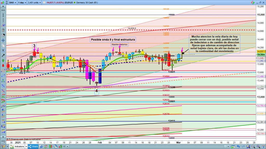 Opción de quiebre de 14075, validación de posible onda 1 u onda 5 final de movimiento alcista, parada de momento en la directriz sobre los 14102 puntos a unos 18 puntos de la zona esperada en el 161,8% de proyección. veremos evolución, y la veremos en el día de hoy. Hasta que los movimientos sean más claros y nobles, prudencia y mucha precaución, ninguna entrada sin claras validaciones y Stop Loss desde el segundo cero del trade, aunque sea scalping.