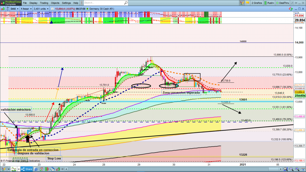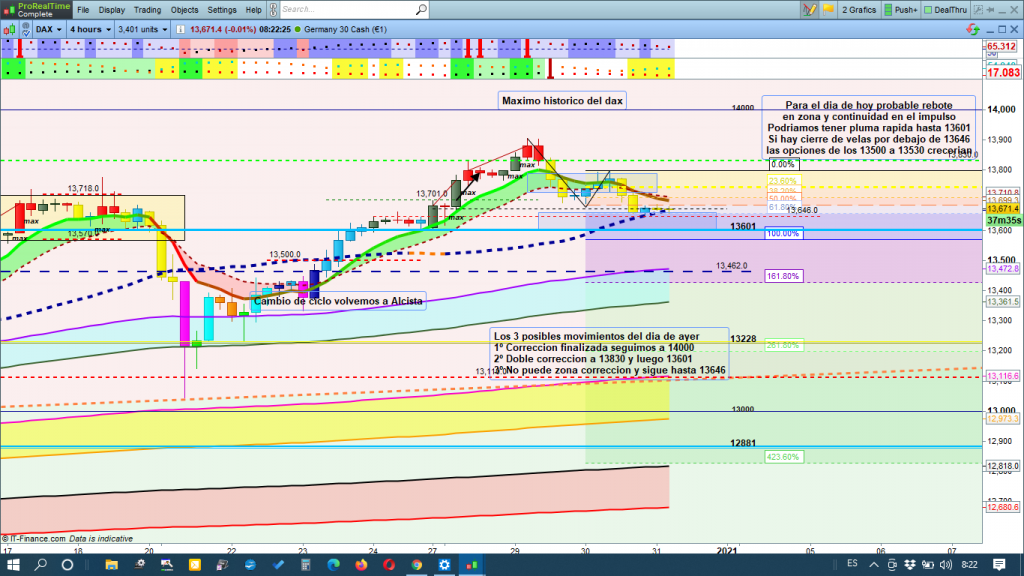 Ayer día de final de año, los movimientos que se tenían que hacer, ya estaban todos realizados, solo día de toma de beneficios por parte de fondos y bancos pequeños que tienen que presentar resultados a sus clientes, los pequeños más experimentados y los más grandes, esperaran a cuando les interese salir por motivos estructurales, independientemente de los compromisos fiscales dependiendo de cada país. Día prácticamente neutro, dentro de zona 13790 a 13740, cuando al final al mediodía, la cotización dax, rompió la directriz inferior, pequeño rally hasta la zona de soporte de corto en 13646, veremos si en sesión asiática entra algo de fuerza o volatilidad y rompe la zona con objetivo 13601.