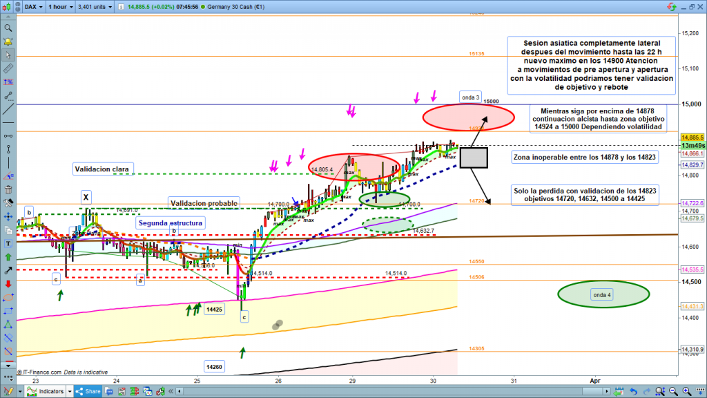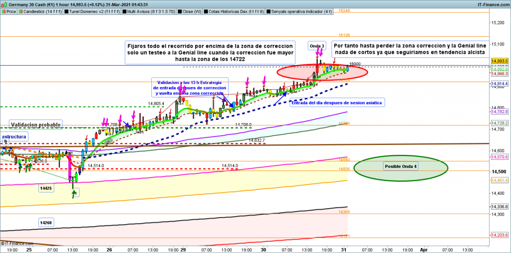 Ya comentaba que era un día de operativa clara, alcanzado el objetivo esperado, al final no ha sido más que la continuación de la validación de anteayer que dio entrada después de estrategia de esperar corrección en 14810. Decíamos ayer en Análisis Diario Dax 30 marzo 2021 , «Operativa clara y fácil para el día de hoy. En el gráfico de 1 hora del dax30, podemos ver la zona operable del día. Mientras la cotización dax, se encuentre por encima de la zona de corrección, a estas horas antes de pre apertura, en la zona 14878, el movimiento debería seguir siendo alcista hasta la zona objetivo de final de la onda 3, en la zona 14924 a 15000.»