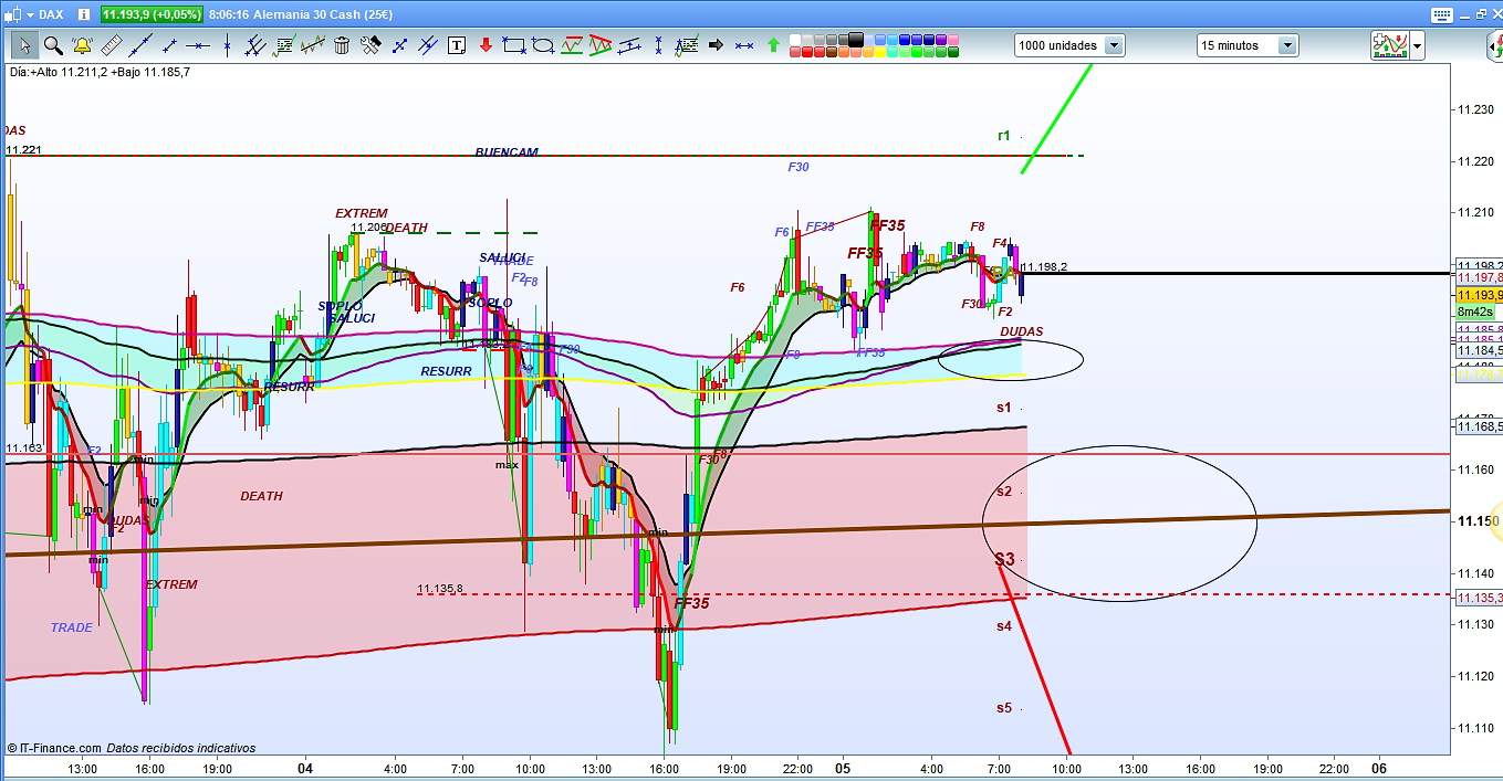 En M15, con mucho más detalle, podemos ver que la primera zona de resistencia es la comentada anteriormente en 11221, y por debajo la primera zona de soporte importante que encontrará el precio, está entre 11184-11178. Rota la primera resistencia en 11221, tendríamos la evolución antes mencionada al alza. Si el recorrido del precio es bajista y hubiera quiebre de la zona de soporte, tenemos otra amplia zona de soporte en el muro entre 11163 y 11135, solo con quiebre y confirmación claro de esta zona, habría evolución hacia la nueva zona de soporte más importante que hemos detallado antes con el gráfico de H1. Como siempre muchísima atención al PA del día que hoy lo tenemos casi en la misma cota de ayer, hoy está en 11198,2 en días de pocos recorridos o a primeras horas de las sesiones, es imprescindible el seguimiento del precio versus las cotas diarias, ayer, al final hizo un patrón bastante clásico de días sin tendencia: PA hasta s4, milimétrico, de nuevo a PA, nueva bajada hasta s5, y de nuevo a PA. Hoy debería ser diferente, si que podríamos tener salida, pero va a depender sobretodo de la entrada de volatilidad. Muchísima suerte y muy buenos trades