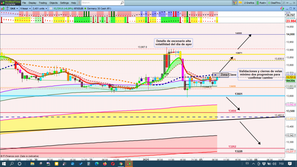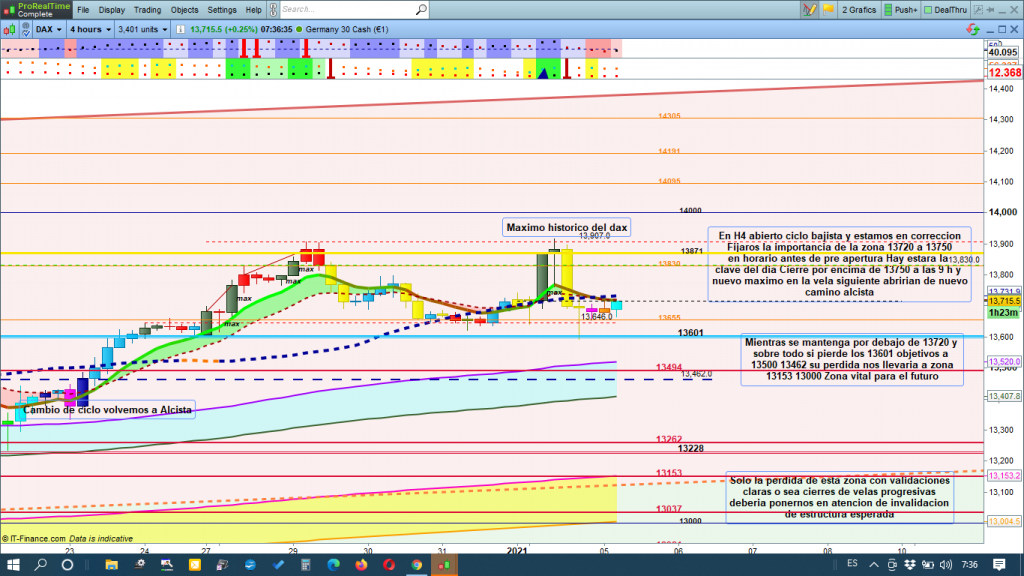 Ayer pese a los grandes recorridos, más de 1000 puntos en todo el día, fijaros que no daba órdenes de trades probables, solo con nuevo máximo, que se dio a las 9 h. buscar estrategia de entrada alcista, esta se dio con claridad en 13814, a las 10,15 h, sin embargo no evoluciono hacia los 14000 esperados y nos echó del mercado perdiendo la zona de corrección y Genial Line, con mínimo más bajo que el anterior de m12 en 13860 a las 15,30 h aproximadamente, día perdido si, pero sin perdidas, solo unos ridículos 45 puntos de profit, en un día de 1000 de recorridos, esto fue en Intradia, seguro que los scalpers experimentados sacaron mucha más rentabilidad. En gráfico de 4 horas del dax30, resaltar la importancia para la sesión europea del día de hoy de la zona entre 13720 y 13750, esta zona será clave sobre todo en la apertura del parquet de Frankfurt. Podría ser zona de corrección de ciclo bajista, y rebotar en esta zona y volver a atacar 13601, cuya perdida nos abriría diferentes objetivos, los primeros 13500 a 13462, con 13494 como eje de zona, y mirando gráfico y cintas de túnel Domènec, su perdida, abriría nuevas zonas objetivo, 13153 a 13000, como zona muy importante a tener en cuenta para un posible cambio estructura en caso de validar también la perdida de esta zona. Para mí, lo más lógico y probable, sigue siendo que la cotización dax, cierre en apertura de las 9 h, la vela por encima de la zona del 13750, y con nuevo máximo de la siguiente vela, reemprender el camino alcista. La superación de 13871, apertura anual 2021, y su confirmación de quiebre, empujaría probablemente con fuerza la cotización dax hacia los 14000, y zonas superiores.