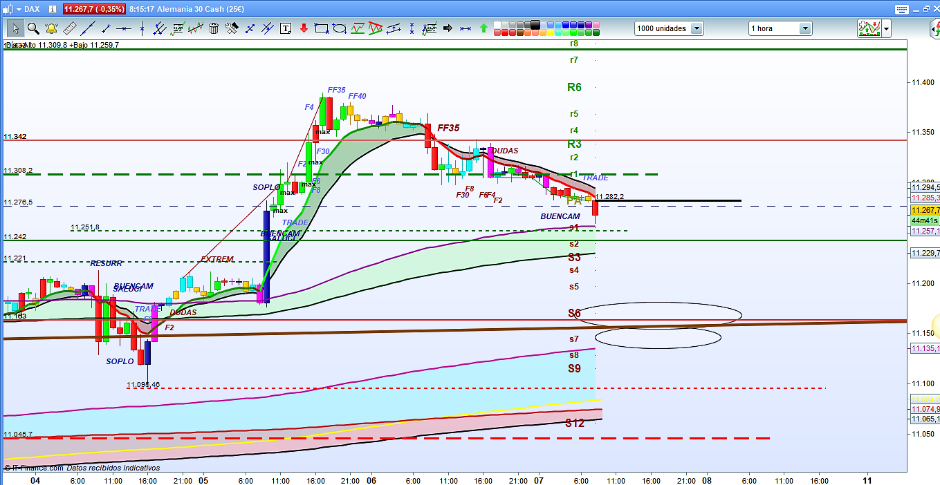 Si ponemos el zoom un poco más y miramos el gráfico de H1, ahí si que podemos observar con más claridad, que por poca volatilidad que entre hoy, si que podría ser un buen día para recorridos bajistas, con objetivo final en las cotas diarias s7, s8.