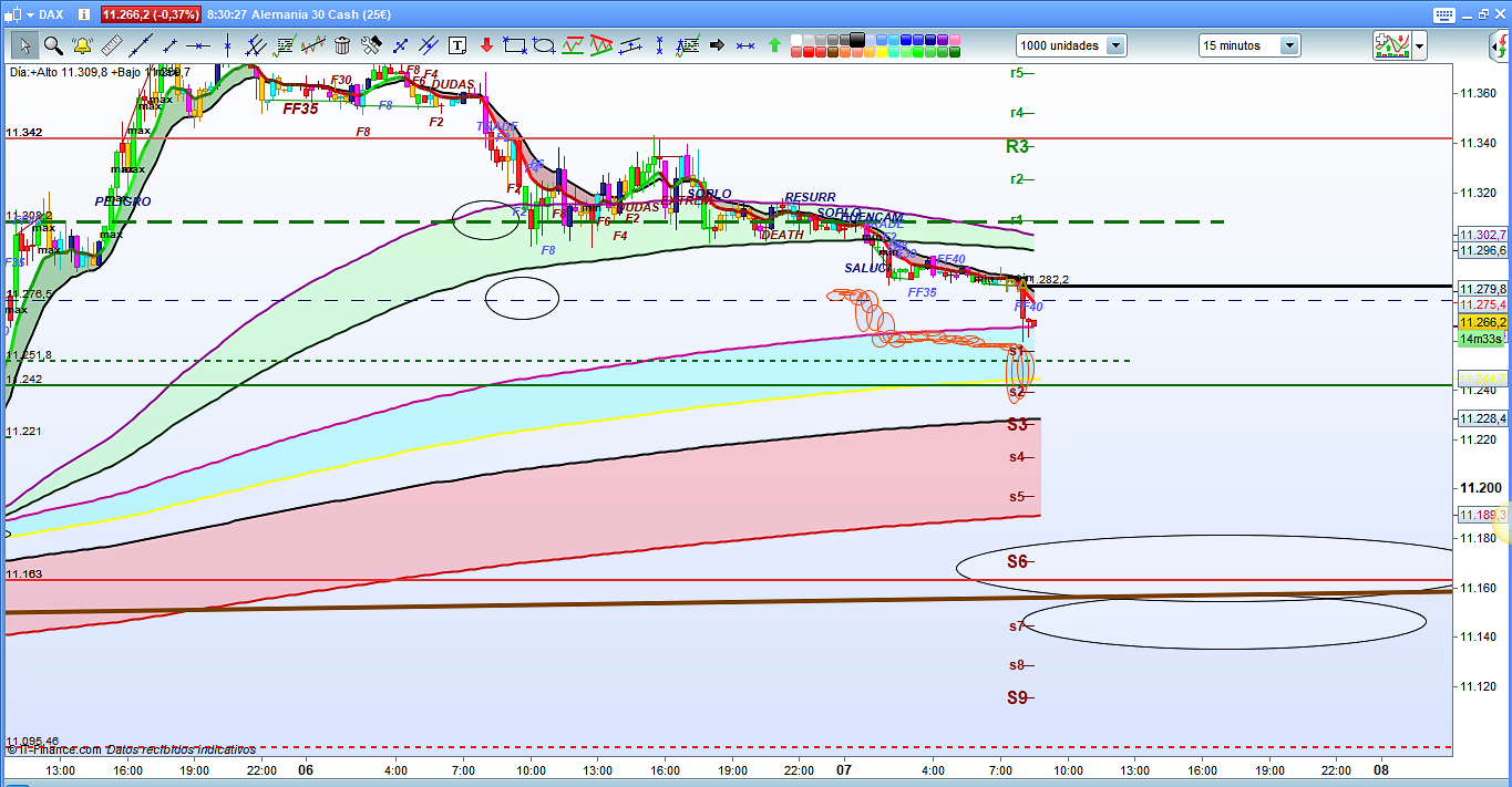 En M15, ya para delimitar más el campo de operaciones del día, tenemos un primer soporte en 11242 que, dependiendo de la hora en que lo ataque, muy posiblemente tendremos un tipo de patrón u otro. Una vez perdido este soporte tenemos toda una zona amplia, entre 11227 y 11188, donde el precio puede entrar en movimientos erráticos, de difícil operatividad para quien no este dentro del mercado. Quebrada esta zona, ya movimientos claros hasta en principio el objetivo diario. Recordad que todo depende de la volatilidad. Las estructuras y objetivos con estudios y análisis técnicos son valorables, sin embargo, el factor tiempo en realizarlos es mucho más complicado.