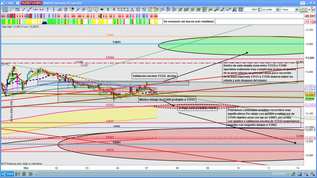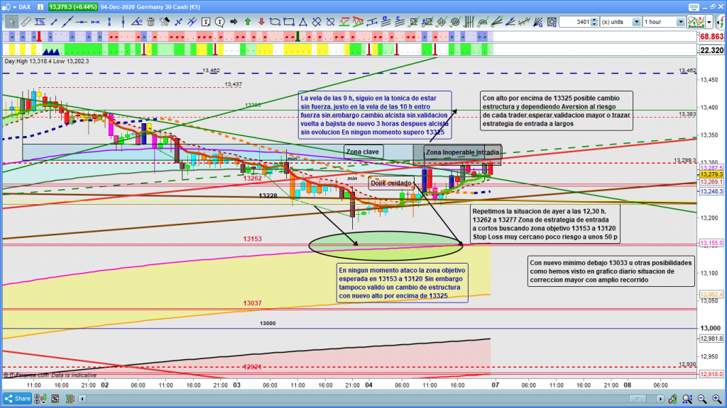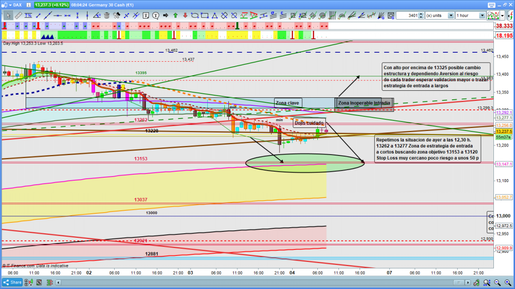 Y con lenguaje escrito explicábamos las posibles estructuras o movimientos así: «De momento seguimos a la espera de alcanzar el objetivo 13153 a 13120, y en esta zona cuando la alcance rebote más que posible. Veremos como va en la pre apertura de las 8 h, pero se podría dar una situación clavada a la de ayer a las 12,30 h, con posible entrada de cortos en la zona entre los 13262 y los 13277, o reemprender camino sin llegar a esta zona de entrada con la volatilidad que se suele dar tanto en la pre apertura, como mucho más importante en apertura de Frankfurt una hora después. En el caso de que siga por encima de la zona comentada, la zona entre 13295 y 13325, es inoperable para Intradias, solo con un alto por encima de esta zona o con cierres encima de zona clave, deberíamos buscar estrategia de entrada a largos.» y lo ocurrido el pasado viernes fue lo que vemos en el siguiente gráfico: