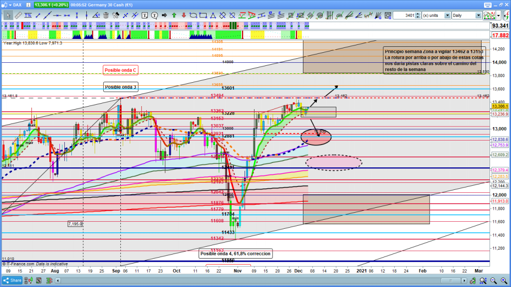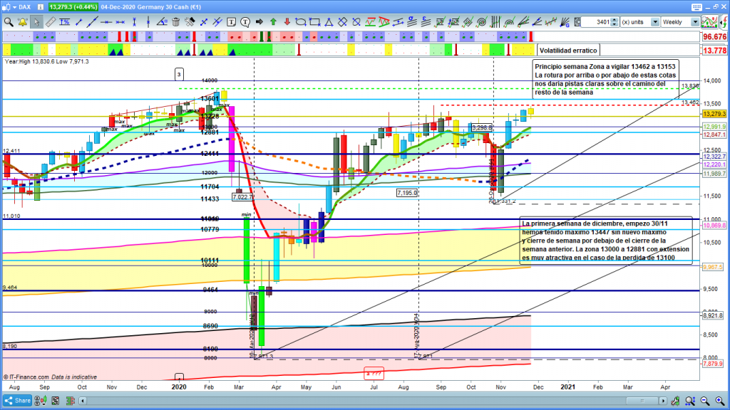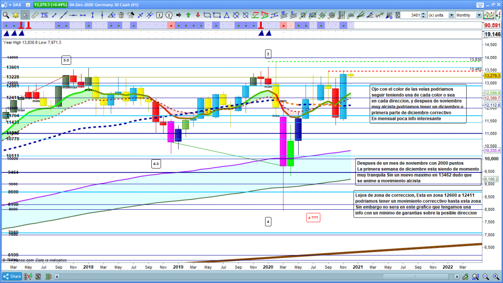 En el gráfico semanal del dax30, más detalle de la vela de esta última semana, que empezó con el último día de noviembre, día en que realizo el máximo en 13447, y desde este momento todos los días del mes de diciembre, han sido con máximos y mínimos más bajos, hasta el viernes que fue un día neutro sin marcar ni nuevo mínimo ni nuevo máximo respecto al día anterior. dejando la imagen de la semana que hemos comentado. Zonas importantes a tener en cuenta en la zona en cuestión, por arriba 13462, un nuevo máximo, marcaría camino en el medio plazo, 13601, cota histórica importante. 13228, cota histórica coincidente con apertura anual de este año 2020, fijaros bien el año empezó en esta cota, subió hasta máximo histórico en 13830, bajo hasta 7971, un 42% de caída y de nuevo hasta la zona de apertura anual en 13228, para un beneficio del 66% y todo esto ha ocurrido dentro de este año tan peculiar, donde parece que las estructuras que rigen la actual sociedad están cambiando muy deprisa y con la pandemia todo se está acelerando.