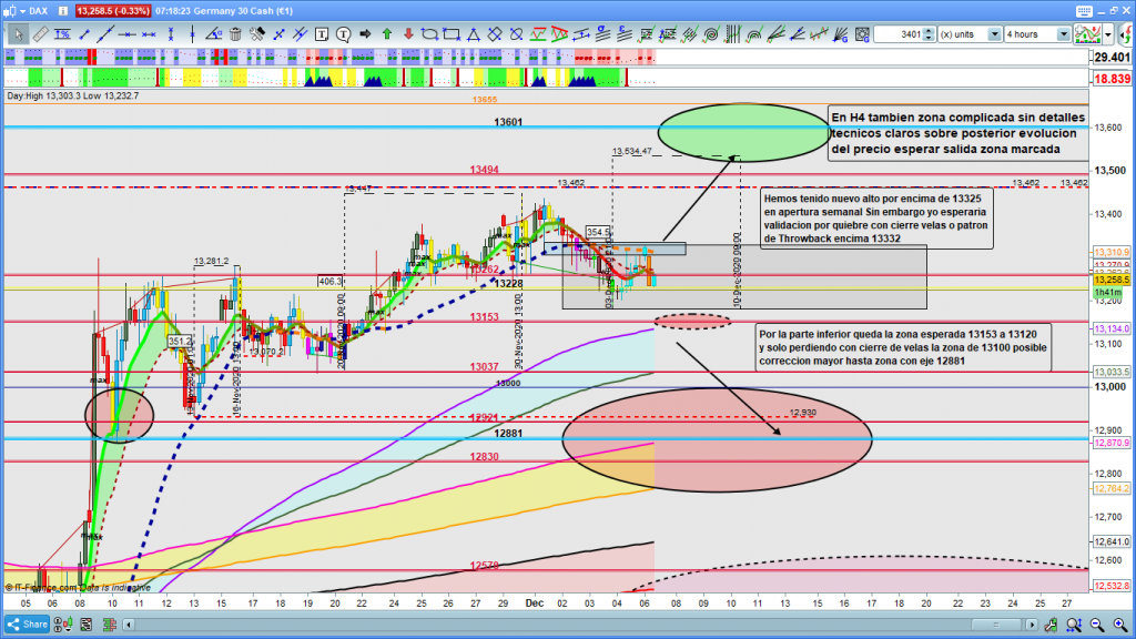 En el gráfico de 4 horas del dax30, situación completamente abierta, la zona comentada y marcada con rectángulo gris entre los 13332 y los 13180, zona muy complicada para operar buscando un swing o incluso una operación Intersemanal, por lo menos hasta que salga de esta zona actual. Por la parte superior una clara validación encima de 13332, después del nuevo alto por un punto en la apertura semanal, nos daría amplias probabilidades del camino alcista hacia 13395, cota y zona de resistencia, que si supera tendríamos un segundo ataque a la zona del 13462, con nuevo alto 13494, 13601. Por la parte inferior, queda la zona esperada la semana pasada en 13153, zona que una vez alcanzada debería dar un rebote, y dependiendo del recorrido del mismo, si posteriormente perdiera los 13100 con validaciones, corrección mayor a zona con eje 12881, si en cambio este posible rebote validara nuevo alto encima de 13332, tendríamos continuidad de impulso alcista antes ya comentado.