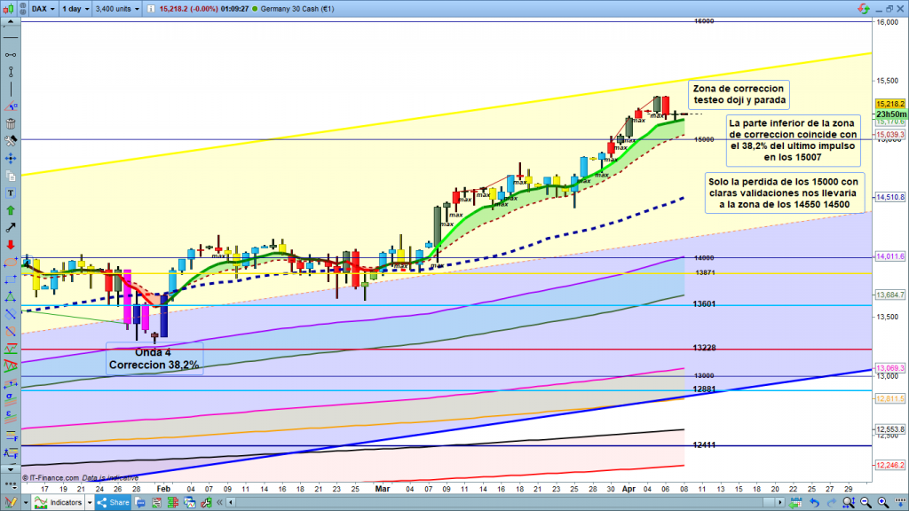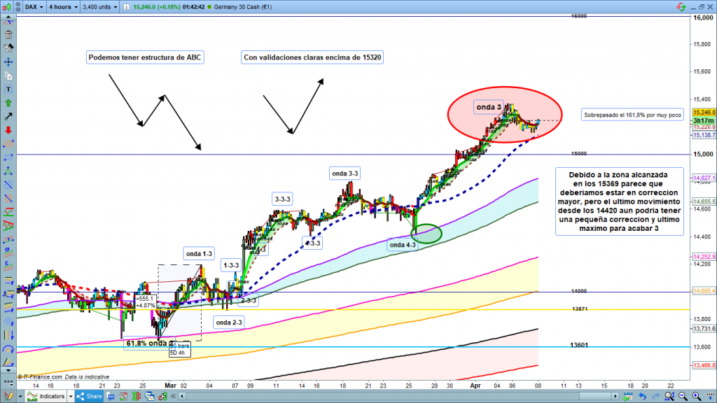 Análisis diario Dax, estudio técnico. El PA en la cotización Dax está en 15250, Estudios con ondas de Elliot para entender qué es trading con el Dax30.