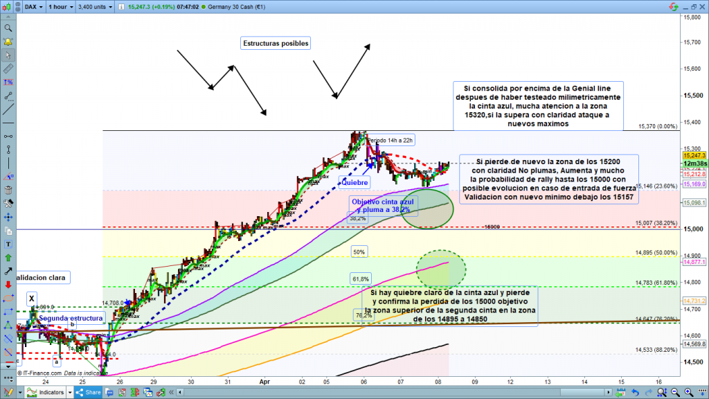 En gráfico de 1 hora del dax30, como siempre detalles más ajustados de la zona operable del día. Testeada ayer la cinta azul de corrección, de momento reboté y situados por encima de la zona de corrección. Si consolida y sobre todo si supera la zona de los 15250, ataque probable, si entra algo de fuerza, a la zona del 15300 a 15320. Solo superando este último, o sea los 15320, de forma clara tendríamos muy probablemente un nuevo ataque a máximos antes de empezar corrección más importante que la actual. Si no consigue superar esta zona entre los 15250 y los 15300, y vuelve a rally bajista, muy importante la posible perdida de los 15200, ya que esto abriría un nuevo recorrido bajista hacia la zona de los 15000, validación de esta opción con un nuevo mínimo por debajo de los 15157. La zona de los 15000, si se mantiene la falta de fuerza de los últimos días, en caso de que el precio llegue hasta ella, será sin duda un soporte muy importante, aunque si llega hasta allí, dependiendo de cuando llegue, sería muy probable un movimiento, con recorrido o con pluma rápida hasta la zona de los 14895 a 14850, y en esta zona probable rebote a senda alcista de nuevo. Todo lo marcará la fuerza o la volatilidad, sin ellas, deambular lateral largo en tiempo y pequeño en recorridos, en el caso de continuar el movimiento correctivo bajista, sin descartar de nuevo una estructura lateral compleja como la que tuvimos ya, hace unas semanas. Nada más a aportar para el día de hoy, solo que si seguimos con la falta de recorridos interesantes por la nulidad de fuerza en el mercado, Tomad una visión clara de donde estamos y donde podemos ir en gráficos de H4 y H1, o sea 4 horas y 1 hora, y después intentar la operativa en gráficos mucho más pequeños, así tendréis cierto control del mercado. gráficos de 144 segundos o de 3 o 5 minutos. Muchísima suerte y muy buenos trades. Recordar siempre operar a favor de la tendencia, del gráfico base que estéis operando, y que si no se tiene una idea clara de los movimientos, siempre es mejor estar fuera del mercado esperando, que no dentro sin estrategia y perdiendo dinero.