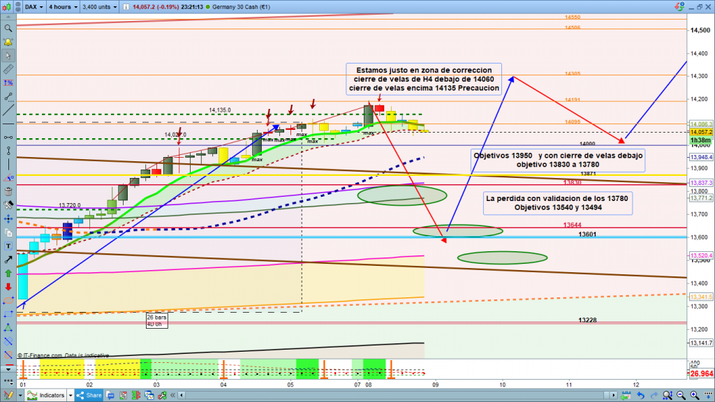En el gráfico de 4 horas del dax30, ahora casi en la finalización del día nos encontramos por debajo de la zona de corrección básica, En caso de cierre de velas por debajo de 14060, objetivo 13950, coincidente con zona corrección diario como hemos visto antes. Si pierde esta zona con validación, cierre velas consecutivas y progresivas por de bajo de zona, objetivo 13830 (también coincidente con diario), a 13780. Perdiendo esta zona con validación, como he explicado antes, sí que el rally bajista sería importante, nuevo objetivo, y posiblemente ya el definitivo a 13540 a 13494, que sería además el 76,2% de corrección de toda esta extraordinaria onda 1. Personalmente opino que lo mas probable es 13830 con posible pluma importante provocada por alta volatilidad, de ahí que ya hace unos días que vengo explicando, que operar esta corrección, quizás es aún más complicado que otras y que por prudencia se deberían tomar parciales con take profits desde bien arriba, para asegurar los beneficios y el trade, y en cada toma de beneficios, en las zonas enumeradas, ajustar los Stops loss, hasta conseguir tenerlos en BE.