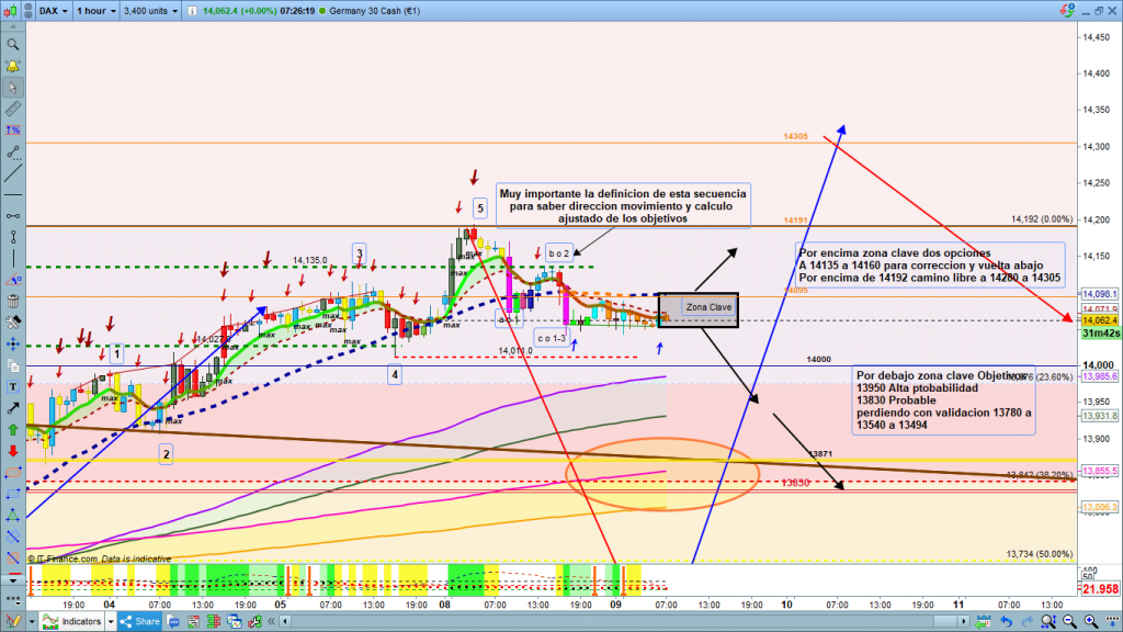 En gráfico de 1 hora de dax30, y ya en horario de final de sesión asiática y antes de pre apertura, la situación de la cotización dax en la estructura en curso, es idéntica a la de ayer a las 00 h. Sesión asiática insulsa sin apenas movimientos, testeando la zona 14060, que precisamente ya había definido como zona importante de validación para rally bajista. Configurada una zona clave entre 14052 y 14098, prácticamente inoperable. Su salida por la parte superior nos daría dos posibles opciones, zona 14135 a 14160 como corrección B, o en el caso de nuevo máximo superior a 14192, camino libre hasta la zona 14280 a 14305. En el caso de una hipotética onda B hasta 14135 a 14160, y que posteriormente emprendiera el camino de bajada, esto haría que el objetivo del movimiento bajista se situara en la zona entre los 13960 y los 13871, sin más plumas ni más extensiones. De ahí la importancia en estas primeras horas del día en pre apertura a las 8 h, o después en apertura del parquet y subasta de inicio a las 9 h, para poder ver exactamente en la secuencia que nos encontramos y así poder trazar de forma mucho más ajustada los objetivos de esta corrección. Recordemos que venimos de un rally alcista extraordinario, con un grado de inclinación de 70º y sin apenas correcciones ni siquiera para marcar mínimamente la estructura, y cuando esto ocurre difícilmente cambia la sensación de mercado tan deprisa. Si la secuencia marcada acompaña, y como vimos que ocurrió en la estructura principal de esta onda 5 la que empezó en 7971, la corrección de onda 2, al ser una onda de tanto recorrido fue de solo el 38,2%, compensándolo después con gran corrección en onda 4, y en este caso el 38,2% de corrección de la actual onda 1, está situada en 13840, justo entre 13871, cota histórica y apertura anual 2021, y la cota histórica de 13830. Para finalizar aparte de la zona 14060 a 14052, para buscar validación, tengamos también en cuenta la zona del último mínimo en 14011 a 14000, como confirmación de validación (cierres de velas). Muchísima suerte y muy buenos trades.