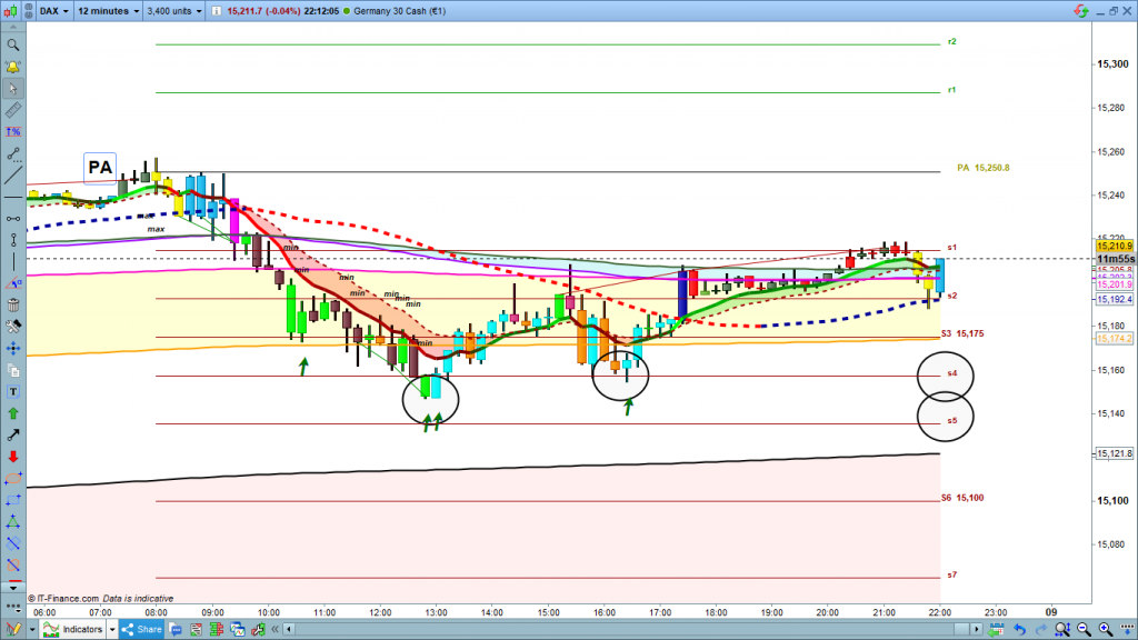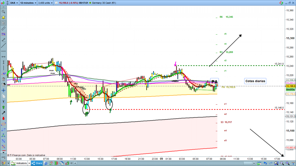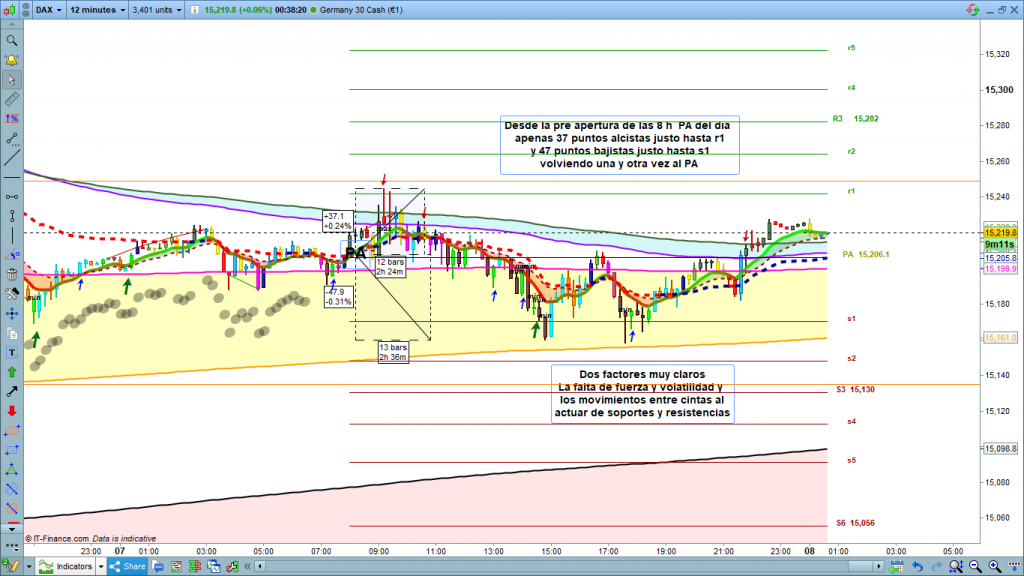 Ayer día neutro de nuevo, pero esta vez si dentro de la normalidad de un día sin fuerza ni volatilidad. Hoy veremos el movimiento de anteayer y el movimiento de ayer con la ayuda de las cotas diarias. Siempre son un buen referente para entender los movimientos del mercado. Ayer a diferencia de anteayer, al menos tuvimos un recorrido claro desde PA hasta la zona de s4 a s5, uno de los patrones que más se produce, el recorrido PA a s4-s5, o PA a r4-r5, se suele dar en más del 60% de los días de operativa. ver estudio realizado y publicado en el menú de formación. Ver en este link Estudio para entender cómo se mueve el mercado mediante indicador Cotas diarias Doc 1ª parte