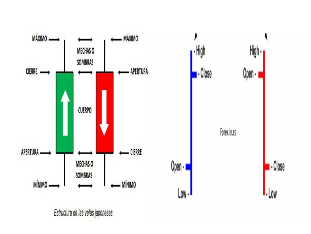 Las velas japonesas son muy antiguas, tienen cientos de años, las barras han sido para occidente el gráfico más utilizado en el pasado más reciente, tienen una antigüedad de unos 140 años, y sin duda son una copia del sistema de las velas japonesas. Los últimos 15 a 20 años, incluso en occidente se han ido imponiendo las velas japonesas debido a su visualidad, haciendo mucho más cómoda la lectura de la información de datos que nos ofrecen. Recordemos, precio de apertura del día, máximo del día, mínimo del día, y cierre del día. En las barras la información ofrecida como podéis ver es exactamente la misma.