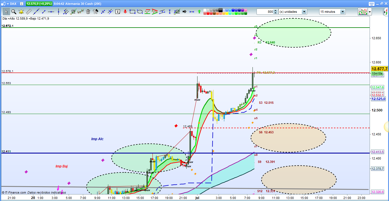 En el gráfico de 15 minutos del dax30 poca información adicional en el día de hoy, ya que el hueco abierto en apertura semanal deja espacios para que la cotización dax pueda evolucionar en un sentido u otro. Por este motivo el gráfico de referencia del día debe de ser el gráfico de 1 hora. Sin embargo, como cada día, sí que marcaremos las zonas dónde es más posible que la cotización dax, si llega, consolide dentro de la zona, tanto para continuar camino como para, posteriormente, corregir. Al final el PA del día en la cota histórica del 12578 Esto abre, si cabe, más dudas sobre la evolución de la cotización dax: si encuentra apoyos sobre la cota histórica podría ir a buscar la zona del 12672, sin embargo, si no consigue situarse por encima de la cota histórica, podríamos tener una corrección hasta la zona antes comentada del 12463, con posible cierre del hueco de apertura semanal no realizado, aunque desde que está cobrando ya tanta importancia la cotizacion de la zona de Oriente Medio los domingos, deberemos de acabar adaptándonos a una operativa de 6 días, en lugar de 5 . Muchísima suerte y muy buenos trades.