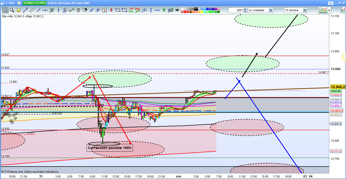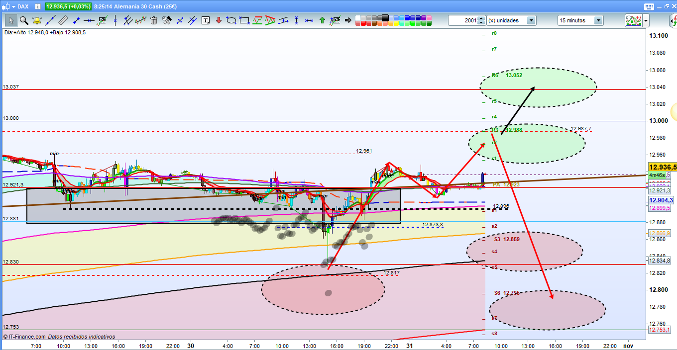 En el grafico de 15 minutos del dax30, varios detalles: si vemos el rango de los movimientos de estos ultimos dias, los posibles objetivos tanto el superior como el inferior quedan muy lejos, para hacer el recorrido en un solo día, a no ser que la publicación de datos empleo Usa, sea una sorpresa muy grande en un sentido u otro, y muy alejada del consenso. ademas segun los datos de la encuesta privada ADP publicada el pasado miércoles, no parece que se pudiera dar una gran sorpresa. Por otro lado, hoy viernes 1 de noviembre, es un dia operativo en los mercados, sin embargo, despues de la celebración de Halloween, lo más normal es que haya pocos inversores en el mercado, y por tanto no haya suficientes contrapartidas, para la evolución de un dia de mercado normal. Los que ya llevéis unos cuantos años en este negocio, sabréis que los dias asi, suelen ocurrir dos cosas, o que la cotización dax, practicamente ni se mueva debido a la falta de contrapartidas del mercado, o justo todo lo contrario, que debido precisamente a la falta de contrapartidas, los grandes inversores con muy poco capital, sitúen a la cotización dax, donde a ellos les interese, generando rápidamente importantes recorridos. Muchísima suerte y muy buenos trades.