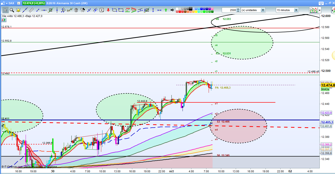 En el gráfico de 15 minutos del dax30 poca cosa más podemos aportar: Vimos como ayer respetó las zonas objetivo marcadas durante el día de operativa, sin embargo en sesión asiática (siguen estando muy activos desde hace semanas), la cotización dax se desplazó más de 40 puntos hacia arriba, rompiendo zonas que eran importantes y, sobre todo rompiendo el claro patrón bajista en curso. Podría ser que ahora que han convencido del camino alcista a más de uno, la evolución de la cotización dax en el día de hoy sea bajista hacia la zona del 12411. Sin embargo, recordad que ahora no hay validación de cortos clara con el nuevo escenario dibujado hasta perder la zona del 12300, y para más claridad aún para swings a más largo plazo la zona del 12142. Para la operativa Intradía, técnicas de scalping y mucha atención a la zona del 12496, aunque podría hacer un nuevo máximo y corregir hacia abajo de forma importante hacia la cota 12411 antes comentada. La verdad es que estamos en zona complicada con pocas referencias para buscar objetivos Intradía, cotas diarias y zona de corrección de la ema/wilder8, en gráficos pequeños para tener un buen control del trade si estáis dentro. Muchísima suerte y muy buenos trades.