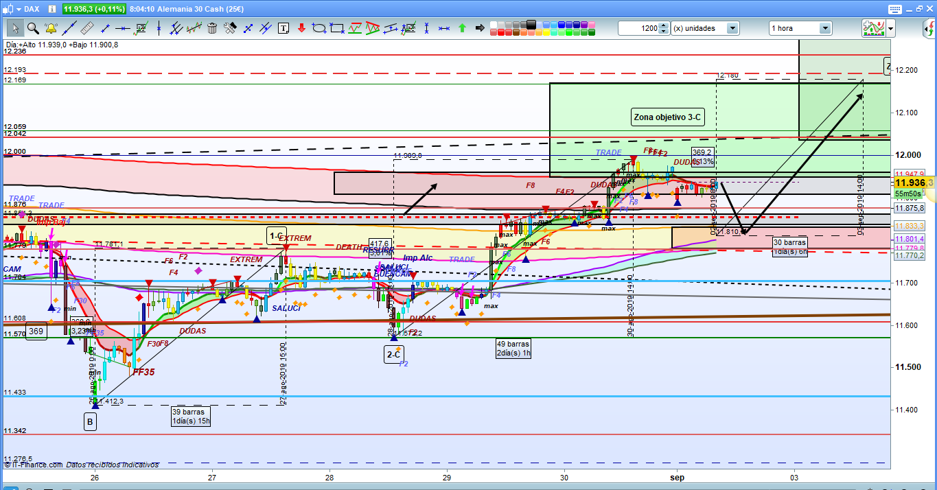 En el grafico de 15 minutos del dax30 poco más a añadir. La zona operable del día, en el caso de que no haya alta volatilidad, es la marcada en el gráfico, y los posibles recorridos ya explicados anteriormente nos llevan a la misma zona, tanto si los calculamos de una forma o de otra, y además coinciden con las zonas más probables de las cotas diarias. Repito, esto en el caso de que no entre alta volatilidad y tengamos una entrada en el mes de septiembre tranquila y pausada, al menos hoy y mañana. Muchísima suerte y muy buenos trades.