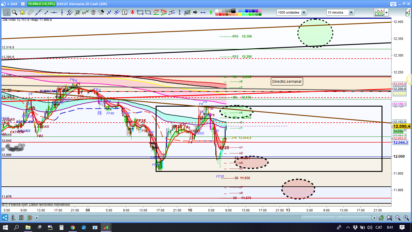 En el gráfico de 15 minutos del dax30, podemos ver con más detalle lo anteriormente comentado. Hoy, a parte de los acotamientos de la estructura, poco más podemos decir. Solamente especial atención a las zonas del 12100 y del 12042 para que nos sirvan como referencia. Además tenemos marcadas las zonas más probables, tanto dentro de la zona acotada como si la rompiera. Mucho cuidado a las 14:30-15h cuando se despierte el artista, que muy probablemente dará los buenos días a los chinos via tweet. Cada día estoy más convencido, que esta forma tan anómala de actuar es completamente premeditada y la utiliza mediante su familia o empresas para sacar provecho de los mercados. De momento, a estas horas, parece que el movimiento podría ser por arriba. Sin embargo, lo más probable es que se mueva en plan errático sin perder la zona marcada. A partir de las 17.30 a 18h, hoy sí que lo más aconsejable es estar fuera de los mercados y con todo cerrado. Muchísima suerte y muy buenos trades.