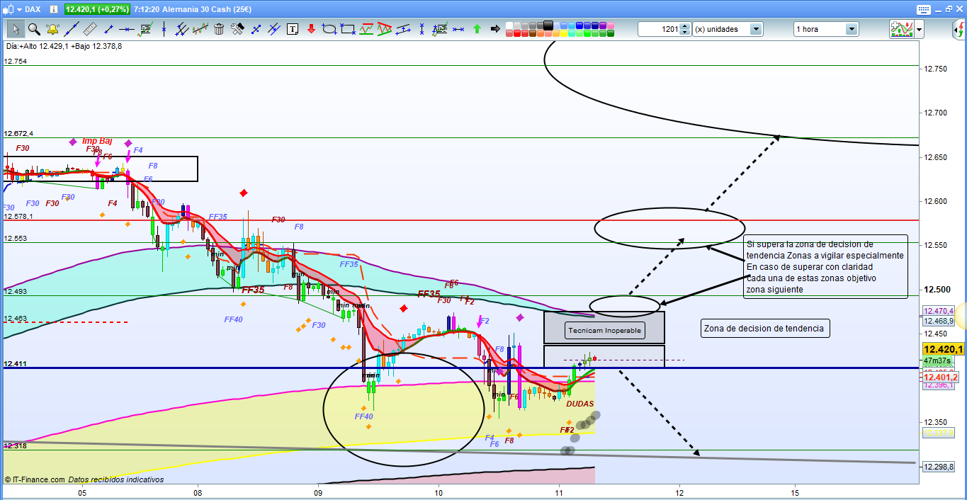 En el grafico de 1 hora de el dax30, muchos detalles interesantes para tener una vision más clara de los posibles recorridos. Para empezar en sesión asiática hemos tenido en este grafico de 1 hora, un cambio de ciclo de bajista a alcista de momento confirmado, aunque frenado por estar dentro de la zona de corrección de 4 horas como hemos visto antes. Por tanto por la parte superior tenemos tres zonas casi superpuestas de fuerte resistencia. Solo quebrando las tres zonas y por encima de 12493 tendríamos un trade de altas probabilidades hasta la zona del 12553 a 12578. Y solo con quiebre, confirmación, validación de la cota 12578, tendríamos camino libre hasta la zona del 12662 a 12754 12830. donde deberíamos estudiar la estructura formada en esta posible subida para conocer el objetivo final de manera más ajustada. Por la parte inferior, cumplir ha cumplido, sin embargo quedándose en la parte más alta de la zona objetivo, por lo que no deberíamos descartar de momento, en el caso de que la cotización dax se situara de nuevo por debajo de la zona del 12411, que nos regale un nuevo rally bajista hasta la zona del 12310, que seria la zona media ideal de la corrección.