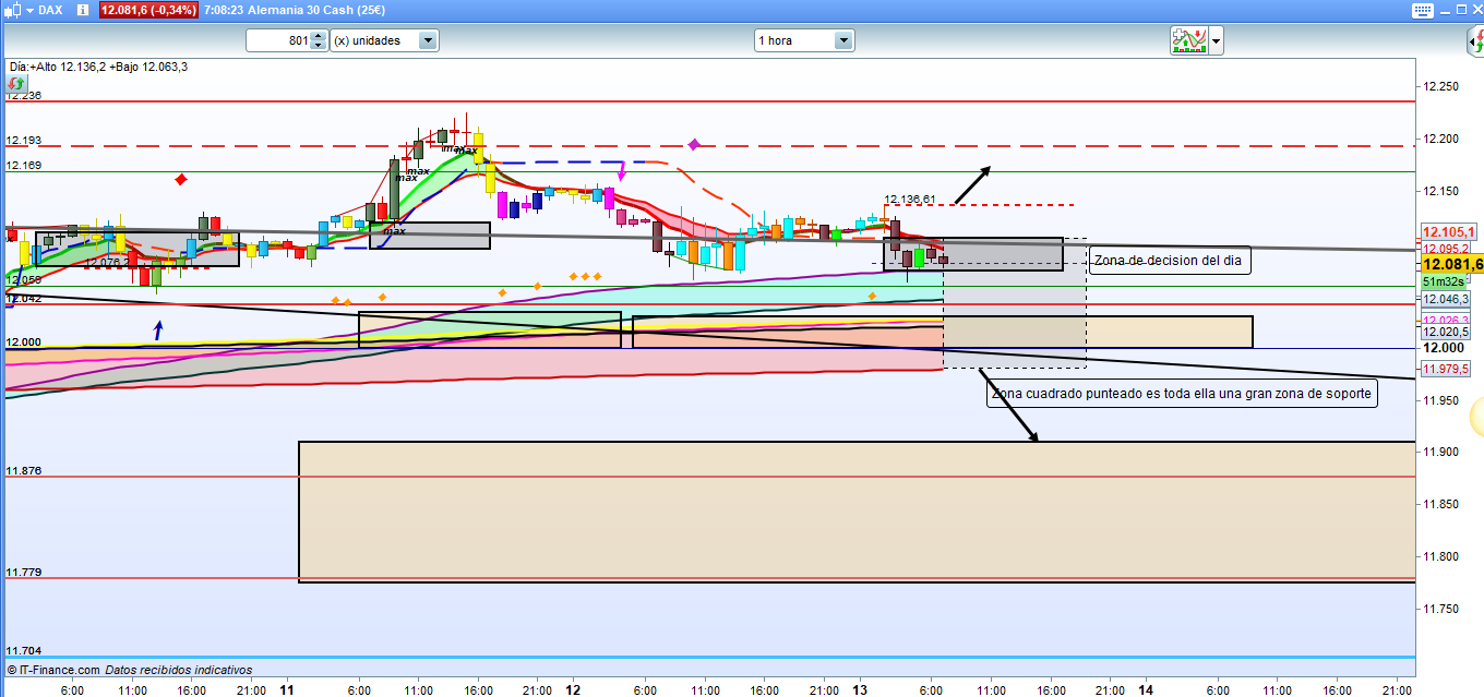Esto, haciendo un símil con el refranero, es como cuando se juntan el hambre con las ganas de comer. Sesgo ligeramente bajista, gran indecisión, zona muy llena de soportes (es lo que siempre suele ocurrir en las situaciones de corrección mayor o de cambio de tendencia), y lo más importante de todo, debido a la indecisión, volatilidad nula. Resultado un día completamente errático, donde la cotización dax, prácticamente ni se movió de la zona de decisión del día. Quizás debería haber previsto esta contingencia y haber dibujado el rango de la zona de decisión, inoperable siempre, con un rango un poco más amplio.