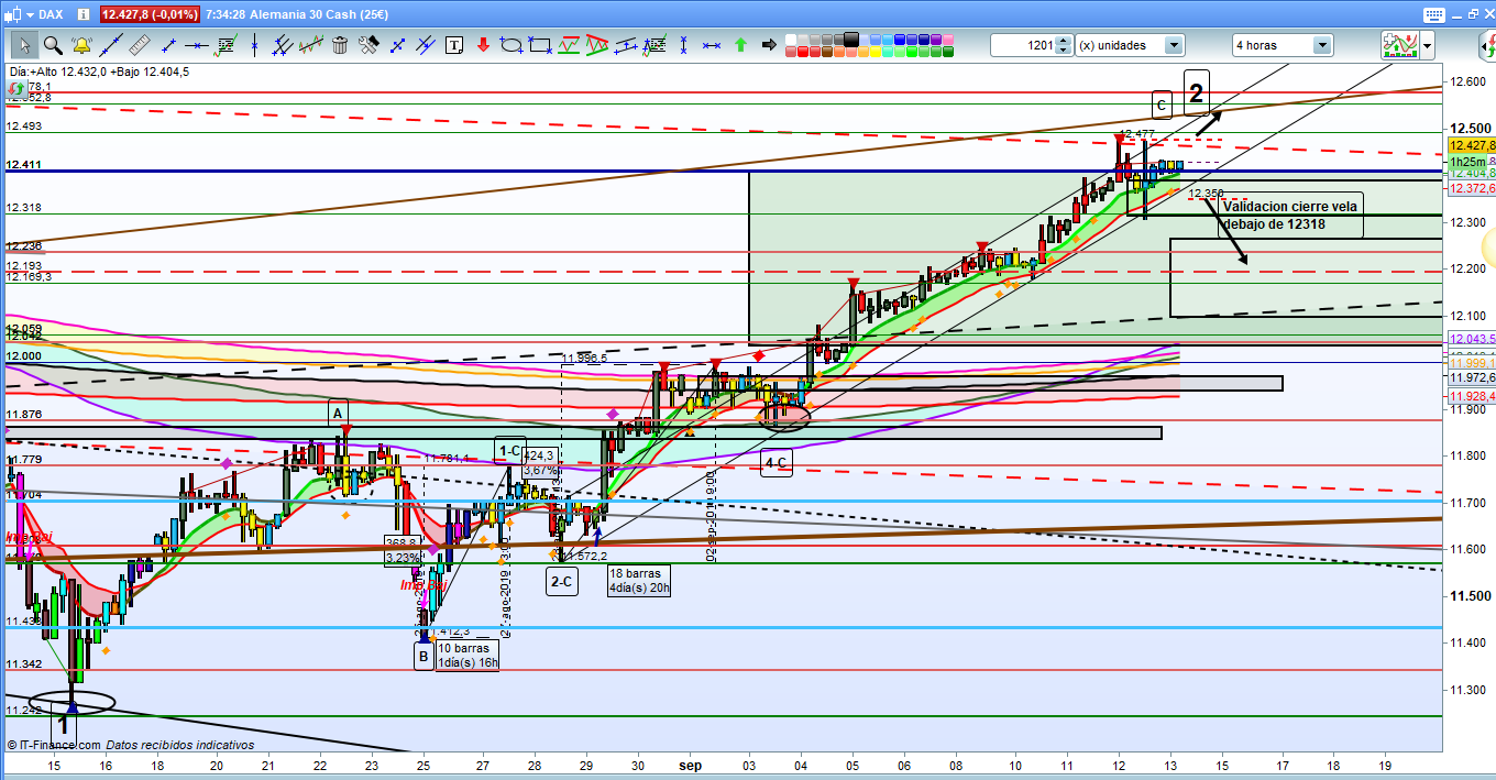 Tecnicamente, hemos llegado a la zona objetivo de el posible movimiento correctivo u onda 2, Como veníamos proyectando desde finales de agosto, primeros de septiembre, una vez descartada la posible onda 4 de 1, marcamos y con claridad los objetivos posibles de esta onda 2. Es más establecimos, dos posibles objetivos en 12236, y en la zona del 12411, superados los 12236 en gráficos más pequeños establecimos la zona de las dos directrices y ademas en anteriores análisis explicamos detalladamente el porque. En el dia de ayer a la 1h y despues sin nuevo maximo, a las 14,45 h, testeo a la directriz de corto que como explicaba tanta importancia habia adquirido desde el mes de julio. Y por encima quedaría todavía la directriz trimestral, que para hoy pasa por la zona del 12520. Teniendo en cuenta que por mediciones el objetivo era 12365, y la importancia de la cota 12411 ademas del doble testeo a la directriz de corto sin nuevo maximo, el movimiento más probable debería ser que estuviéramos ya en la onda 3 de C bajista que muy posiblemente sera en 13 movimientos entre impulsos correcciones, y que durara meses, y con objetivo en la zona del 9750 a 9900, sin embargo las validaciones claras de este movimiento, estan muy por debajo de la zona de la cotización dax actual, paciencia. La invalidación de este movimiento seria solo con un nuevo maximo por encima de 12663.