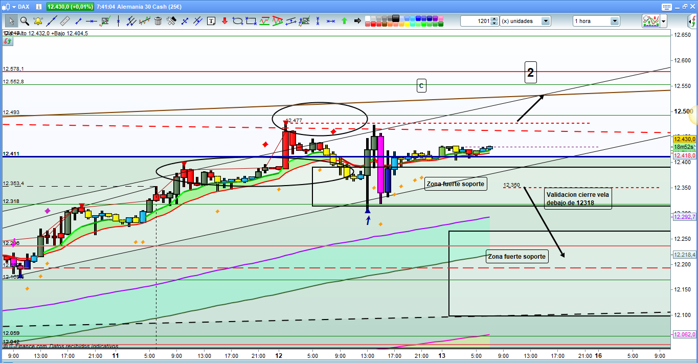Fijaros pese a un desplazamiento en pocos minutos desde 12305, hasta 12474, 170 puntos al final , todo y la gran volatilidad, todo fue solo ruido, El dia empezo en 12415 a las 8 h y acabo a las 23 h en 12415. Justo en la zona de la cota histórica muy importante de 12411. Por la parte de arriba, la cotización dax paro de segundas en la directriz de corto, ademas sin hacer un nuevo maximo del anterior a la 1h (la importancia de disponer de un grafico con la cotización de las 24 h, imprescindible), y por la parte de abajo la cotización dax paró en la zona del 12318, claramente señalada y detallada en el grafico, ya que solo su perdida (con cierres de velas de cierta importancia por debajo) marcaría ya una clara estructura bajista.