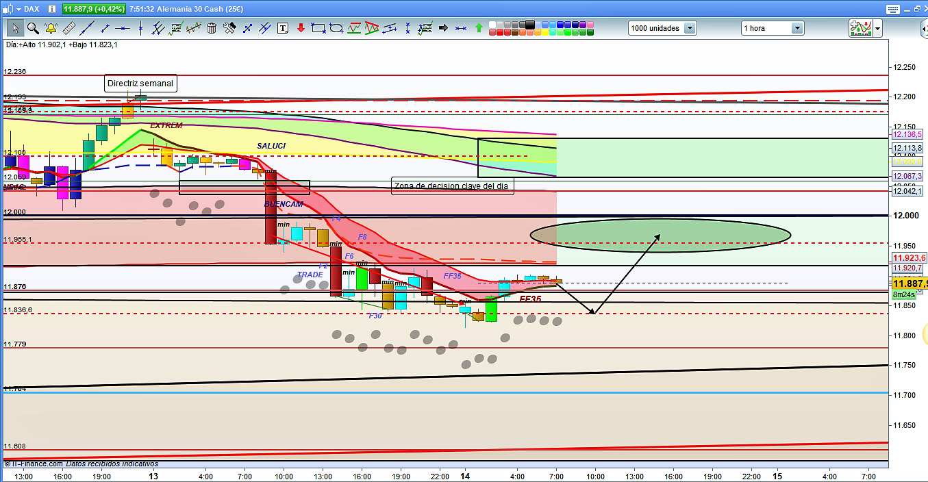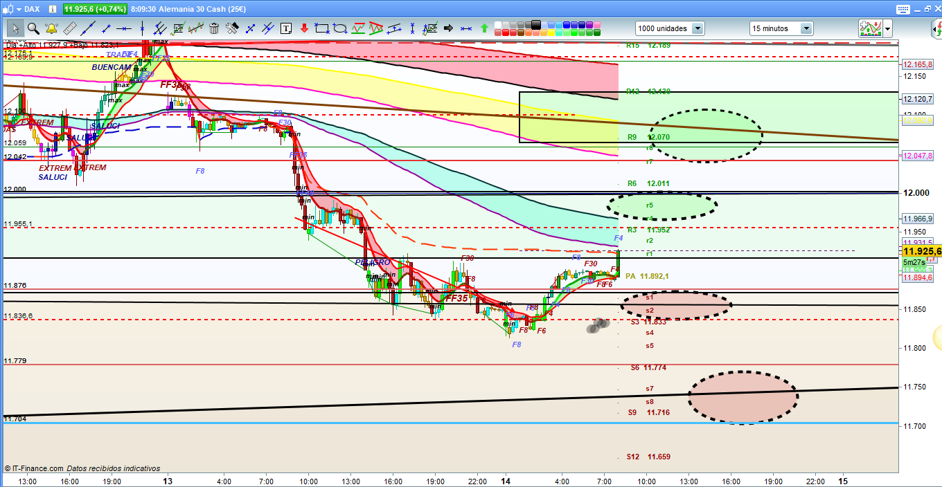 En el grafico de 15 minutos del dax 30, podemos ver la proyección para el dia de hoy, de momento, la pre apertura de las 8h. ha sido con fuerza alcista pero solo de salida, de momento no invalida la figura correctiva más normal que se preveía esta mañana. Por tanto toda una declaración de intenciones en cuanto a volatilidad. Tened en cuenta todas las zonas de soporte y resistencia marcadas en el grafico, tanto o más que los objetivos marcados. En gráficos grandes, parece que el movimiento bajista no ha finalizado, por tanto, no es momento de pensar en grandes recorridos intersemanales, solo operativas Intradia, que ya dan muy buenos recorridos. La zona más peligrosa, si el precio llegara hasta ella, es sin duda la zona 11850 a 11834, ya que en esta zona si podría rebotar el precio, o atacar y romper haciendo nuevo minimo. Por la parte superior, habrá que vigilar atentamente, la zona 11955 a 12000, por el mismo motivo pero a la inversa, es zona de posible giro para retomar la caída, o si la rompiera es zona que daría paso a una corrección mayor. Hoy sera un dia par ir tomando medidas constantemente, si el trabajo me lo permite intentare hacerlo y colgar uno o dos flash dax, para intentar ayudar en lo posible. Cuando los recorridos de un dia son tan importantes como el de ayer, al dia siguiente, o solo consolida esperando seguir el rally, o como la bajada fue porcentual mente tan importante, se pueden dar correcciones mayores, esto es lo que intentare avisar si puedo. Muchísima suerte y muy buenos trades.