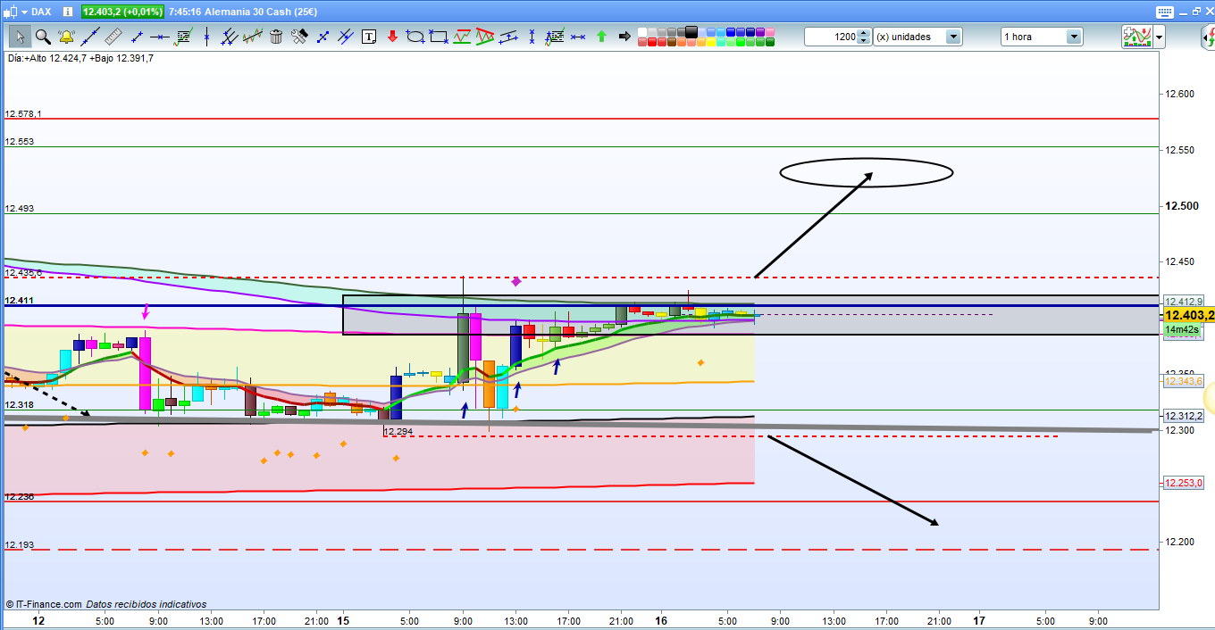 En el grafico de 15 minutos del dax30, poca información adicional, el PA del dia por primera vez en muchos dias ha sido más alto que en el dia anterior. Para dias o momentos del dia con poca o muy poca volatilidad, suele ser bueno apoyarse sobre las cotas diarias y sus correspondientes patrones. (información en apartado de formación del blog). La situación es realmente compleja y en zona de mucha indecisión, solo una apertura como la del dia de ayer, podría romper con claridad esta zona de fuerte resistencia. De momento y mientras siga en esta zona entre la cota histórica de 12411, y la directriz de corto en 12300, zona solo para scalpers, y ademas scalpers con cierta experiencia. Más tarde durante esta mañana en principio publicare el video sobre análisis semanal que viene acompañado de un importante apartado de formación, para que podáis entender como funciona el mercado. Solo conociendo como funciona el mercado, se puede llegar a ser rentable. Muchísima suerte y muy buenos trades.