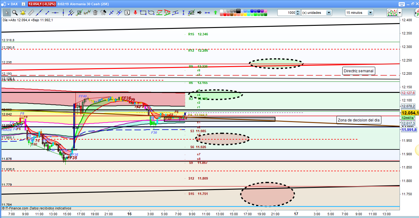 En el gráfico de 15 minutos del dax 30 tenemos más detalle de la zona operable para el día de hoy. La cotización del dax30 en el día de ayer tuvo una alta volatilidad, con más de 650 puntos de recorrido en 3 direcciones diferentes. Pocos días se ven con estas condiciones. Mirando el detalle para el día de hoy, en este gráfico se puede apreciar que, por estructura, la posibilidad de rally bajista, al menos durante la sesión europea, no es tan descabellada. Si la cotización dax buscara una corrección del 61,8% al 76,2% de el último rally alcista de ayer nos llevaría a la zona comentada de 11915 a 11965. Por lo tanto, mucha atención a si la cotización dax pierde la zona clave del día, y sobre todo si pierde de nuevo los 11992. Por la parte superior, rebotando en la zona clave del día, tendríamos el recorrido y las resistencias antes explicadas. Detalladas en el gráfico, las diferentes zonas objetivo, dependiendo de la evolución versus la zona clave. Muchísima suerte y muy buenos trades.