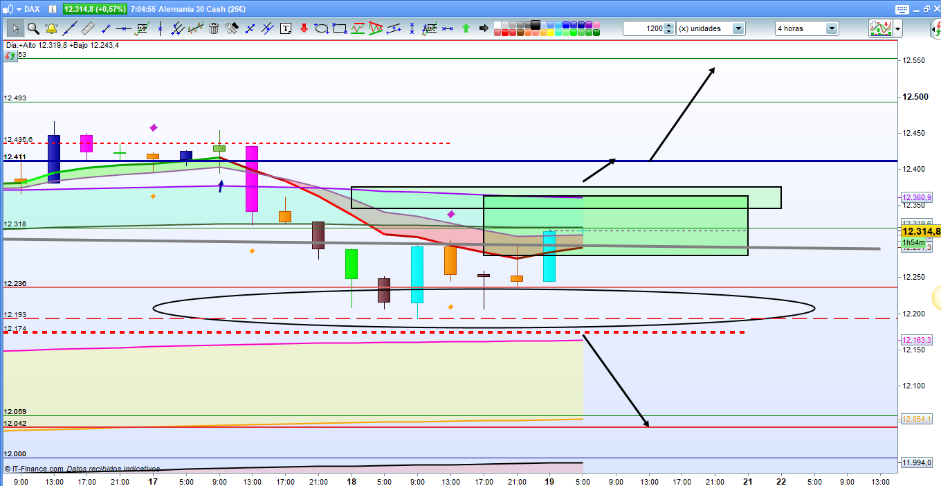 Durante el día de ayer, después de la sesión asiática claramente bajista, la cotización dax llegó hasta la zona objetivo esperada, testeando milimétricamente la cota histórica del 12193. Entiendo que cuesta de entender que haya una serie de cotas históricas y que, después de meses o años, cada vez que la cotización dax pasa por su zona, el mercado o los inversores las recuerdan y siempre juegan un papel importante, pero la realidad es que es asé. Y tener esto claro y conocer la situación de estas cotas siempre es muy importante a la hora de entender el funcionamiento del mercado. En el día de ayer la cotización dax testeó 12193 y desde allí hasta la zona de la directriz de corto plazo que viene desde junio del 2018. Personalmente pensaba que podía haber pluma hasta 12318, pero en la zona del 12300, área de la directriz, rebotó de nuevo y hacia abajo.