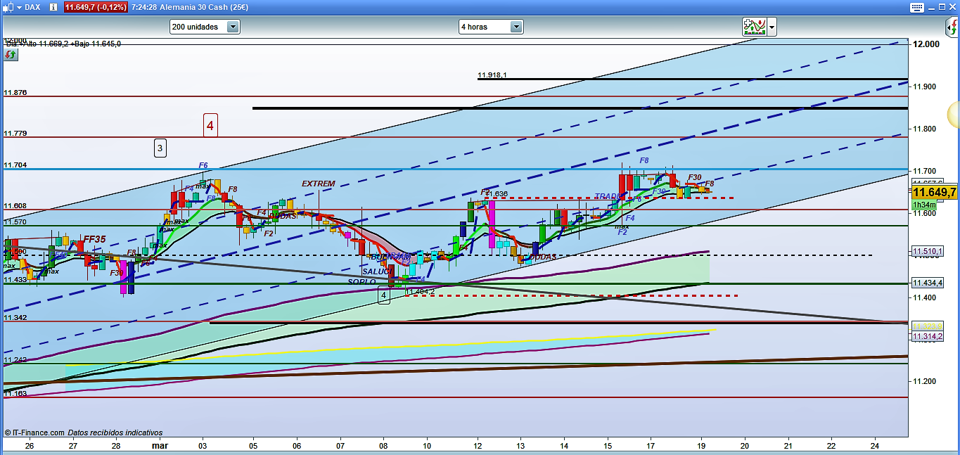 En el gráfico de temporalidad de 4 horas poca información relevante, sólo algunos detalles que sí que son importantes. Podemos ver que la fuerza del recorrido de la cotización Dax desde el último máximo es descendente: desde el f8, f30 positivos que marco en 11704, ahora estamos en f30, f8 negativos o rojos. Por tanto, de momento lo que señala esta situación es que el dax30 está corrigiendo. Recordad que el precio siempre se mueve por impulsos y correcciones y que ésta es la base para saber cómo hacer trading y operar los mercados. Además, vemos perfectamente la zona delimitada por el canal de Elliot. Sólo a título informativo, de canales se pueden dibujar muchos en cualquier gráfico, sin embargo sólo los que tienen una base correcta a la hora de su dibujo nos proporcionaran información importante para operar. Esto es lo que es trading. La pérdida del canal con quiebre de la directriz inferior sí que nos daría señales muy claras de la evolución futura del dax30.