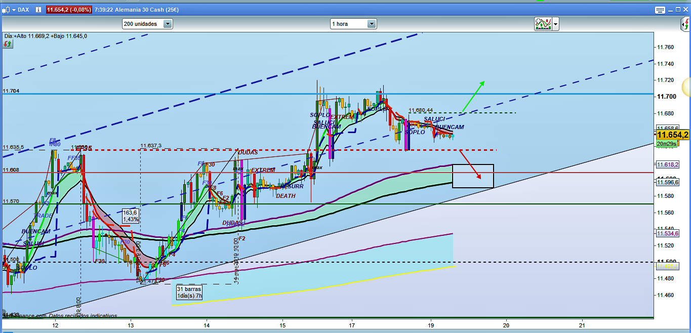 Como cada día, en el gráfico de la temporalidad de 1 hora del Dax30 alemán podemos ver la situación general con más claridad. El mínimo de ayer, en 11634, validaría el recorrido bajista pendiente hasta la zona esperada y comentada anteriormente 11620 hasta 11590, con eje en la cota histórica del 11608. Recordad que es una corrección y que estas se suelen comportar aun de forma menos noble, por lo tanto, como siempre dice el maestro Carlos, sin codicia. No intentéis esperar y apurar todo el trade buscando el último objetivo posible, al menos no sin haber tomado beneficios con cierres parciales anteriormente. Este negocio consiste en ganar dinero, no todo el dinero posible. Quien mucho quiere abarcar muy poco va a coger. Conociendo los recorridos probables lo mejor es buscar los tramos más seguros y posibles en medio de estos recorridos, y ahí hacer nuestros trades. Después paciencia, a estudiar los movimientos del mercado y, solo cuando hemos detectado y tenemos claras validaciones de un posible nuevo recorrido, volvemos a actuar exactamente igual. Es mucho más rentable hacer dos operaciones, máximo 3 al día, con un alto porcentaje de aciertos, que ir persiguiendo el precio por el gráfico sin ton ni son, donde lo más probable es acabar en pérdidas.