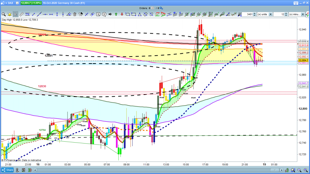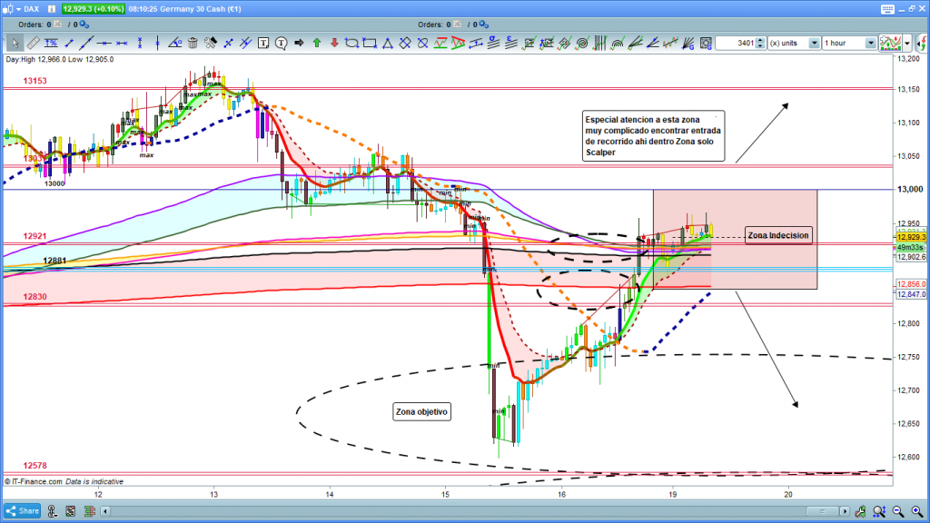 En gráfico de 1 hora del dax30, vemos como el movimiento esta teóricamente en el límite, sigue alcista porque esta por encima de la zona de corrección, y por encima de todas la cintas, sin embargo no se acaba de despegar de la 3ª cinta, y las últimas velas, las de sesión asiática, han sido todas de momento con muchas plumas, al no poder evolucionar el precio. A nivel de estructura del movimiento este último máximo conseguido, validaría también estructura completa, pudiendo quedar el movimiento finalizado o subir como comentábamos más arriba hasta los 13000 a 13037, me reitero intentar operar principios y finales de movimiento nunca suele ser una buena practica rentable, pienso qu es solo territorio scalper, y aun así complicado. Para tener una operativa más clara para Intradias o entrada en Intersemanal, deberíamos esperar un poco, a ver si la situación se aclara. Hoy si debería ser importante a apertura de Frankfurt, y la volatilidad que origina, para ver unos minutos después si toma algún camino claro. Las zonas viendo el gráfico de H1 siguen siendo las mismas que comentaba en el gráfico anterior, Consolidando con cierres de velas por debajo de 12881, buscar entrada a cortos, con recorridos significativos, solo consolidando por encima de 13037, buscaríamos posible entrada a largos, sin embargo con demasiadas posibilidades en cuanto a objetivos, y algunos de muy corto recorrido. Muchísima suerte y muy buenos trades y paciencia