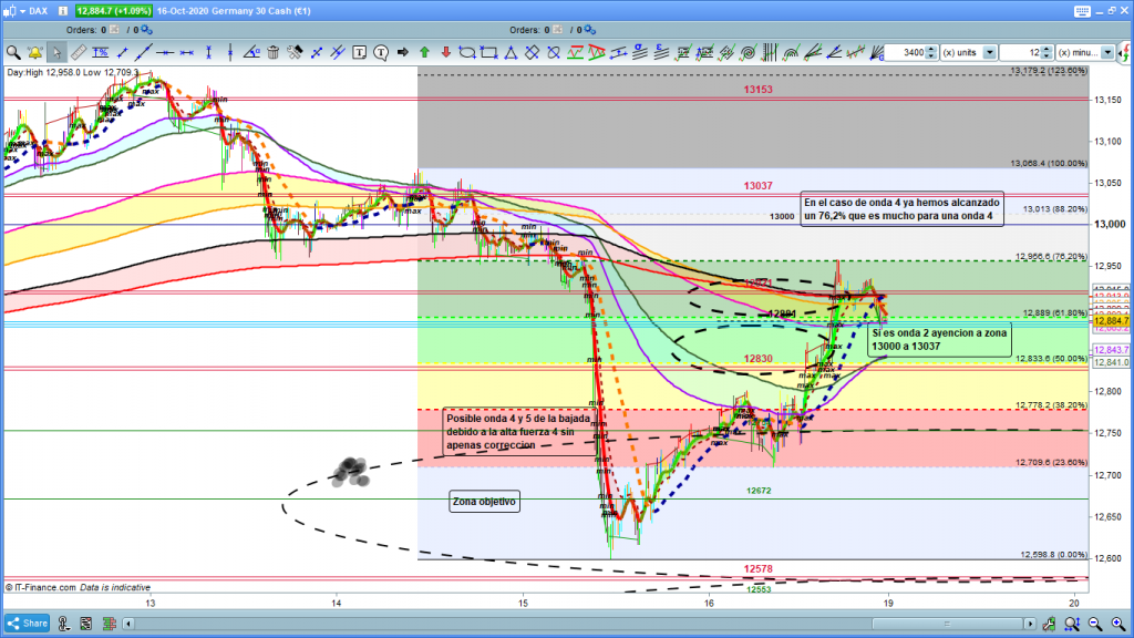 Estas son las dos opciones más claras de la situación actual. estamos o hemos finalizado movimiento correctivo finalizado de onda 2 u onda 4, o seguimos en curso correctivo de onda 2. Solo un máximo con cierre de velas de tempo importante por encima de los 13037, invalidaría la proyección de este movimiento bajista. Ahora en gráfico de 4 horas veremos más claramente la situación.