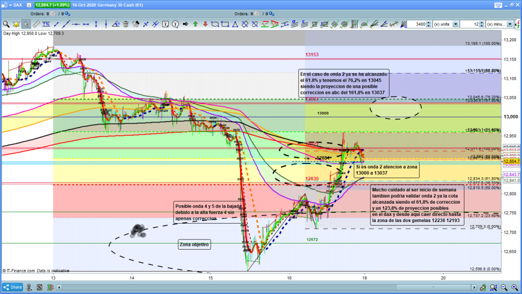 A primera hora del viernes, parecía que el movimiento podía estar ya finalizando y que la zona correcta para salir, al menos en parcial del trade en curso quien estuviera dentro, era la zona del 12830, y en esta zona esperar un posible giro y sobre todo la validación clara para una entrada a cortos, sin embargo esta validación no se dio en ninguna temporalidad, ni siquiera en las más pequeñas, fijaros que ni siquiera, no se produjo ningún mínimo más bajo que el anterior, con lo que hubiéramos podido tener un inicio de posible cambio de dirección, o como mínimo una corrección mayor con recorridos interesantes y cuando la cotización dax encontró soporte entre la zona de corrección M12 y la cota histórica 12830, sobre las 14:20 h. salió con fuerza hasta la cota 12881, cota histórica importante de origen semanal, que paso sin parar ni apenas validarla y siguió hasta la zona superior máxima antes comentada en los diferentes tempos. Ahí si rebote y a confirmar la cota 12881, donde se quedó a dormir el fin de semana.
