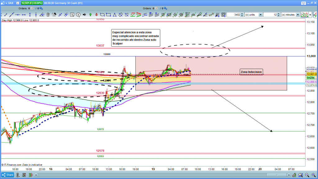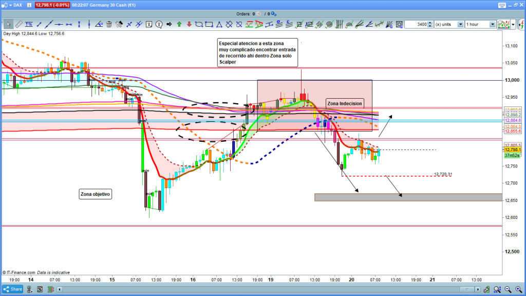 En el gráfico de 1 hora del dax30, vemos con más claridad, lo que comentábamos anteriormente, dependiendo de los movimientos de la cotización dax en la apertura del parquet a las 9 h. podríamos tener un movimiento ascendente. en principio solo correctivo, hasta la zona de cintas de H1, en el caso de que la cotización dax se situara por encima de 12830, hasta la zona comentada de 12881 a 12921, es posible que con pluma rápida como ayer, En el caso de que siga la evolución as normal del movimiento actual, tendremos una clara validación perdiendo los 12720, con objetivos 12670, una vez quebrado, 12578, y con el permiso de la zona del 12500 aproximadamente la cota histórica muy importante del 12411 y su área de influencia. Muchísima suerte y muy buenos trades