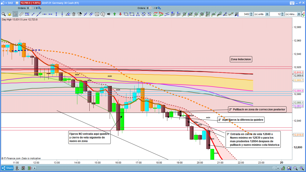 Y esto es lo acaecido, pluma hasta la zona esperada y reseñada, cierre de vela máximo en zona esperada de cintas especificadas y detalladas de los diferentes tempos en el análisis de ayer, todo el día en la zona de indecisión, con movimientos difíciles solo para scalpers, y quiebre de la zona inferior de la zona activando la entrada de la orden, fijaros que con margen suficiente desde 12881, cierre del trade Intradia a las 22 h. con casi 100 puntos.