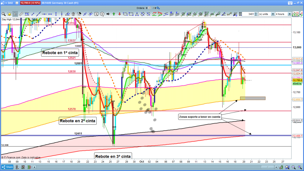 En gráfico de 4 horas del dax30, ya para el día de hoy, vemos como la cotización dax, ha pasado de progresar por encima de su zona de corrección, a evolucionar en sentido bajista por debajo de la misma, además está atacando de nuevo la zona de la 2ª cinta, con lo que el camino más probable, es el bajista con primer objetivo la cota 12578 y posteriormente la cota 12411. Atención a la zona del 12670, ya que tenemos una zona de soporte interesante de una directriz de corto plazo del gráfico de diario. Solo con el cierre de dos velas, consecutivas y progresivas por encima de la zona de corrección, nos empezaríamos a plantear la invalidación de este movimiento para el día de hoy, buscando de nuevo la zona 12881 a 12921, en principio como zona máxima por arriba a alcanzar.