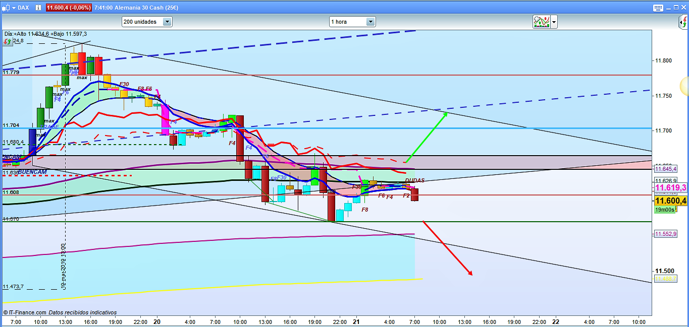 Seguro que muchas veces me habéis leído u oído decir en los videos que es importante que cuando hay un quiebre, éste se confirme con un pullback de confirmación. Pues esto es exactamente lo que parece estar haciendo en estos momentos con la directriz inferior del canal. Si os fijáis después de cerrar velas en el otro lado de la directriz, ha ido a testear la y parece que vuelve a tomar impulso bajista. Un nuevo mínimo (sólo que baje un punto más, no hace falta cierre), de la cota 11569.9 confirmaría este pullback de confirmación y abriría nuevo camino bajista. Por lo tanto, validación por debajo de esta cota de 11570, de rally a cortos con zonas de soporte 11555, 11540, 11490, 11470 y 11433. En el caso de fallo en el pullback y que se situara de nuevo dentro del ámbito del canal, estaríamos en situación de corrección, y las zonas a tener en cuenta serían la misma zona de corrección de H1, la zona de corrección de H4, que se delimita ahora a primera hora entre 11640 y 11655, y sólo superada ésta última cota, tendríamos un recorrido claro hasta la zona antes comentada de 11704-11730.