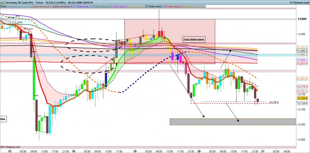 Ataco la cota histórica del 12830, es más una vela cerro justo por encima, pero la siguiente cerraba más de 20 puntos por debajo de la misma, además esta segunda vela sin hacer ningún máximo más alto que la vela anterior, con lo que en ningún momento válido él quiebre para realizar o buscar entrada a largos. y a partir de este punto el resto del día con una ligerísima tendencia bajista pero siempre dentro de la zona de rango de indecisión planteada de 110 puntos, entre los 12830 y los 12720, ambas zonas que ya delimitaban el rango en el análisis de ayer.