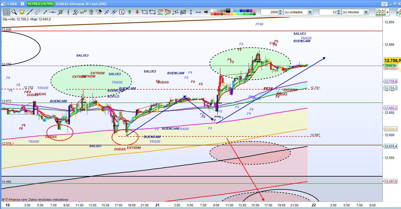 Como cada dia para finalizar, situación de las cotas diarias y zonas objetivos marcadas de alta probabilidad. en el grafico de 15 minutos del dax30. Podemos ver como las diferentes zonas objetivo, coinciden perfectamente con los escenarios proyectados, por tanto mucha atencion a las zonas de validación de cada movimiento, precaución, paciencia y disciplina solo se entra al mercado, cuando segun el sistema de cada uno, hay altas probabilidades de ser rentable, más vale estar mirando y estudiando, que entrar por intuición y que la cotización dax marche con fuerza en dirección contraria, que por desgracia es una realidad que suele acontecer demasiadas veces a los más noveles, Recordar que muchas veces se gana más estando fuera del mercado, es mucho mejor hacer solo 1 o 2 trades al dia, pero de alta probabilidad, que pretender estar todo el rato dentro persiguiendo el precio. Gestión de Capital y Stop Loss bien colocados, son el unico camino para llegar a ser rentables en el tiempo. Muchísima suerte y muy buenos trades.