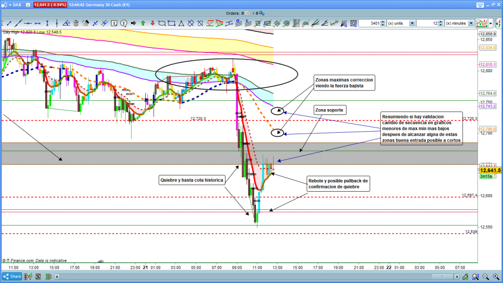 Los dos parámetros que planteábamos ayer por la mañana, primer movimiento de las 9 h. y que entrara fuerza para acompañarlo, se cumplieron y este ha sido el resultado, más de 250 puntos de recorrido. Como podemos ver el primer gran movimiento rompió la zona de 12720, que tan importante fue durante el día de antes de ayer, rompió también con claridad la zona de soporte marcada entre los 12680 y los 12650, y solo lo paro la cota histórica del 12578 con testeo milimétrico a la cota semi histórica del 12553, y rebote. Rebote hasta donde, pues evidente hasta la zona de soporte, para pullback de confirmación de quiebre y continuidad del movimiento. Ayer a las 12 h. cuando ya cerraba los equipos para mis quehaceres personales publique tanto en twitter, como en el foro dax investing, como operaria yo la situación generada en aquel momento, esperando que pueda servir a alguien para ir mejorando sus técnicas y su operativa lo reproduzco aquí de nuevo.