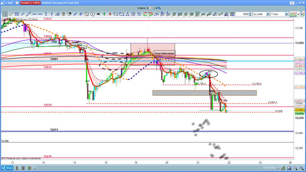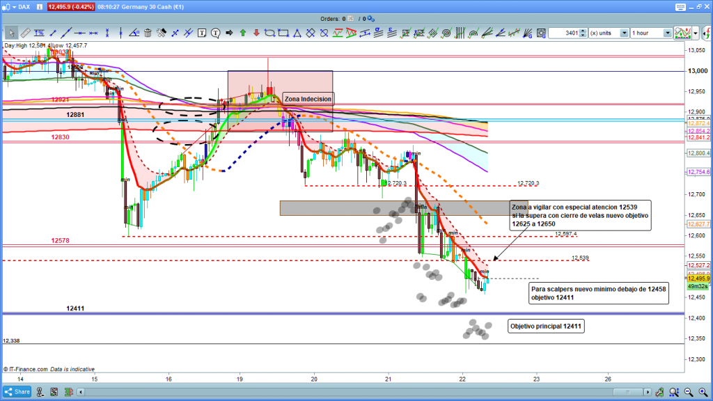 En el gráfico de 1 hora del dax30, vemos con mucha más claridad detalle de la zona operable. Objetivo principal 12411, si lo alcanza repasar lo anteriormente explicado de como se mueve la cotización cuando alcanza una cota histórica, zona a vigilar, ya que podría marcar una corrección alcista, cierre de velas, dos progresivas, por encima de 12539, las plumas no cuentan. En caso de que se produzca este posible zona mínima por arriba 12625 a 12650. Si tenemos un día sin fuerza o con volatilidad, y por lo tanto en consolidación lateral sin recorridos, entonces la cotización dax acabara en la zona objetivo del 12411. Muchísima suerte y muy buenos trades. Sí que agradecería una implicación personal un poco más importante en la visualización o click sobre los anuncios o en pequeñas donaciones, ya que estos últimos 7 meses los costes de mantenimiento de la web han sido los mismos pero debido a toda la situación vivida, los ingresos han sido mucho más bajos por el apartado de publicidad. Es obvio que este año acabaremos en perdidas por el mantenimiento de la web, (prácticamente la única linea roja marcada por y para mí), pero con un poco de colaboración esperemos que estas perdidas sean las mínimas posibles, muchas gracias, también agradecer algunas donaciones de estos últimos meses que han ayudado y mucho.