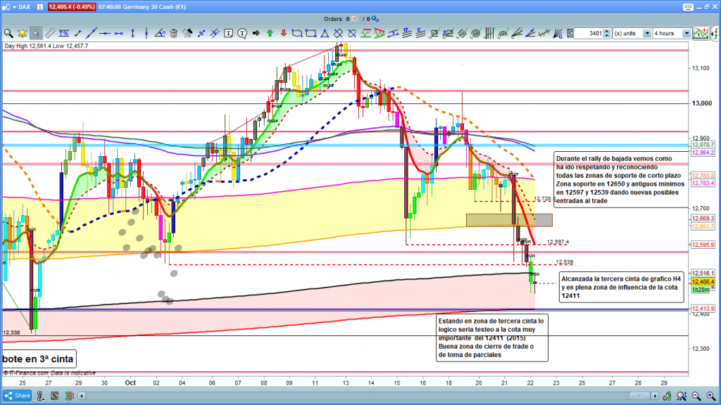 Ya analizando la situación para el día de hoy, en el gráfico de 4 horas del dax30, estamos dentro de zona objetivo esperada entre los 12500 y los 12411, es mas estamos ya de lleno dentro de la zona de influencia de la cota 12411. Lo normal seria que la cotización dax testeara al menos la cota 12411, buen punto de salida, o de toma de parciales para los que vengan con swing. Sin embargo por prudencia y antes de la apertura del parquet, ajustad los Stop Loss a BE+++. Siempre explico que cuando una cotización llega a una cota histórica, solo pueden pasar 3 cosas, que testee y rebote, que la quiebre, y posteriormente confirme quiebre con pullback o trowback, dependiendo de la dirección del movimiento, o que se quede consolidando, buscando apoyos por un lado u otro para rebotar o continuar camino, sabiendo esto, suele ser siempre una muy buena opción, la salida por TP en las cotas históricas y después dependiendo de evolución una posible reentrada con mínima perdida de puntos del recorrido esperado. Después del rally de bajada durante las últimas 24 horas, mas del 2,5%, y teniendo en cuenta el muro que supone como soporte esta cota histórica de origen trimestral, conocida por todos los inversores. Es posible que el día de hoy sea más bien de pocos recorridos, solo con quiebre y confirmación clara por debajo de 12411, destino claro hacia 12236 a 12193 las dos cotas históricas de diario las dos gemelas, sin embargo hay que considerar que si no hay sorpresas se quede consolidando incluso con corrección menor alcista por la zona ya comentada, o consolida próxima a la cota histórica mientras las distintas zonas de corrección van bajando. o en un rebote podría ir a buscarlas, la zona de corrección de H4 esta ahora en 12600 a 12670, por tanto mucha precaucion.